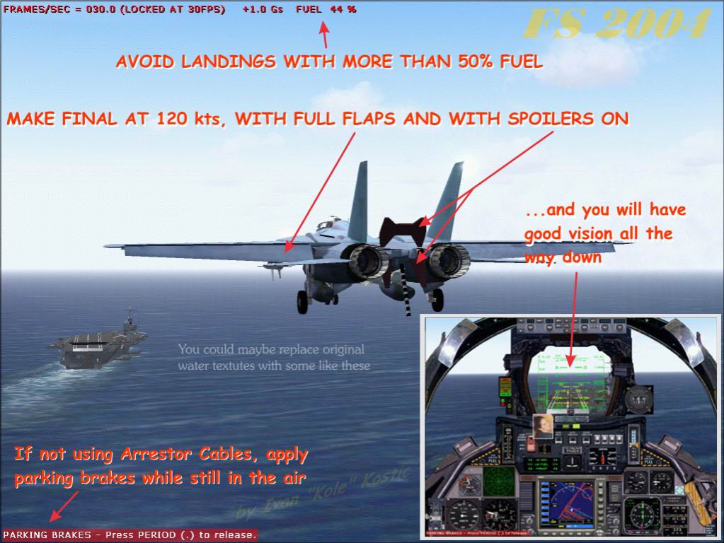 FS2004 F-14B New flight dynamics and sound. Requires Dino Cattaneo’s F-14B for FS2004 here. Contains new Air and Aircraft.cfg files, that will give you good control of the aircraft in the whole flight envelope. You can also land it on the carrier deck without Arrestor Cables, superspoilers or head wind, just apply parking brakes (!) while still in the air (stronger brakes don’t spoil taxiing qualities). Keep 120 kts on final, up to 50% fuel, full flaps, (normal!) spoilers on, and with good vision of the deck all the time, just hit it as close to the cables as possible. There is also a new SOUND folder included, giving you a better feel of flying a thunderbird. By Ivan Kostic. 3.2MB