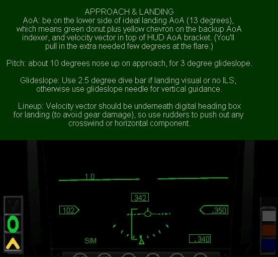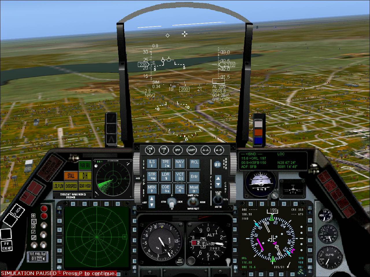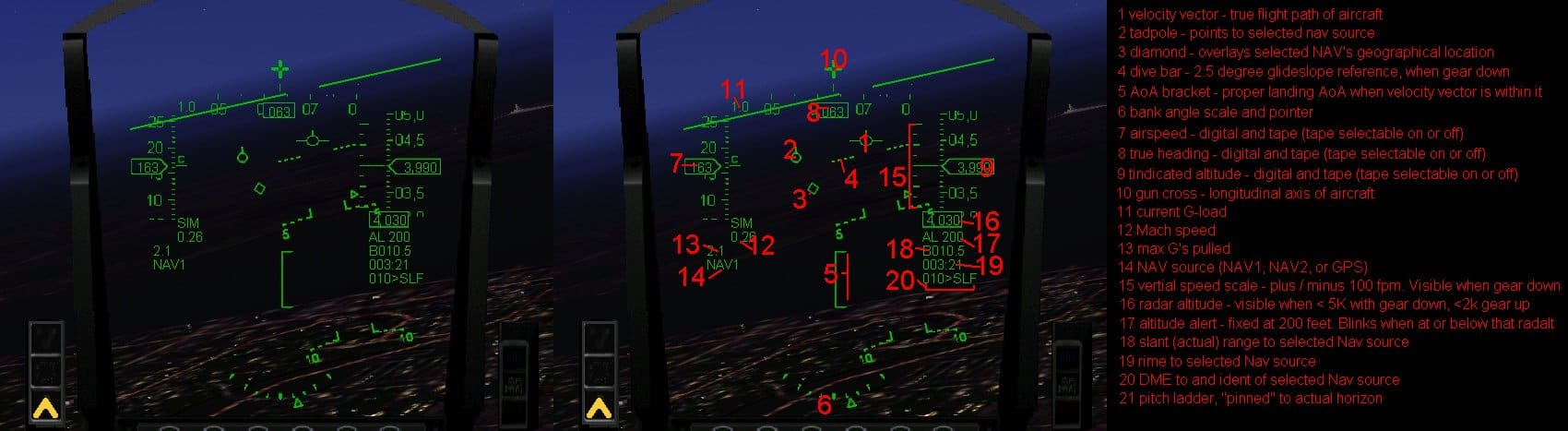 FS2004 F-16 Falcon Panel with a working HUD which both looks and operates very much like the actual F-16’s. (See HUD video in zip file.) This is the most accurate, complex and complete HUD I’ve done. It features: working velocity vector and ladder (of course); both digital and tape-based airspeed / altitude / heading displays (selectable); a working NAV tadpole with NAV data blocks (which can be linked to NAV1, NAV2, or GPS); a waypoint designation diamond (which overlays the actual geographic position of your GPS waypoint or the selected VOR); accurate AoA bracket and backup AoA indexer for precise and realistic landings (13 degrees alpha!); precise ILS bars; 3 selectable symbology colors; various switches to adjust the HUD (power, color, ladder on/off, ladder cage, ILS on / off, tape vs. digital asp /alt /hdg, NAV1 NAV2 or GPS-based steering cues), cuations and resets, and on and on… Intended for use with Kirk Olsson’s Viperden here. Scott Printz. 12.3MB