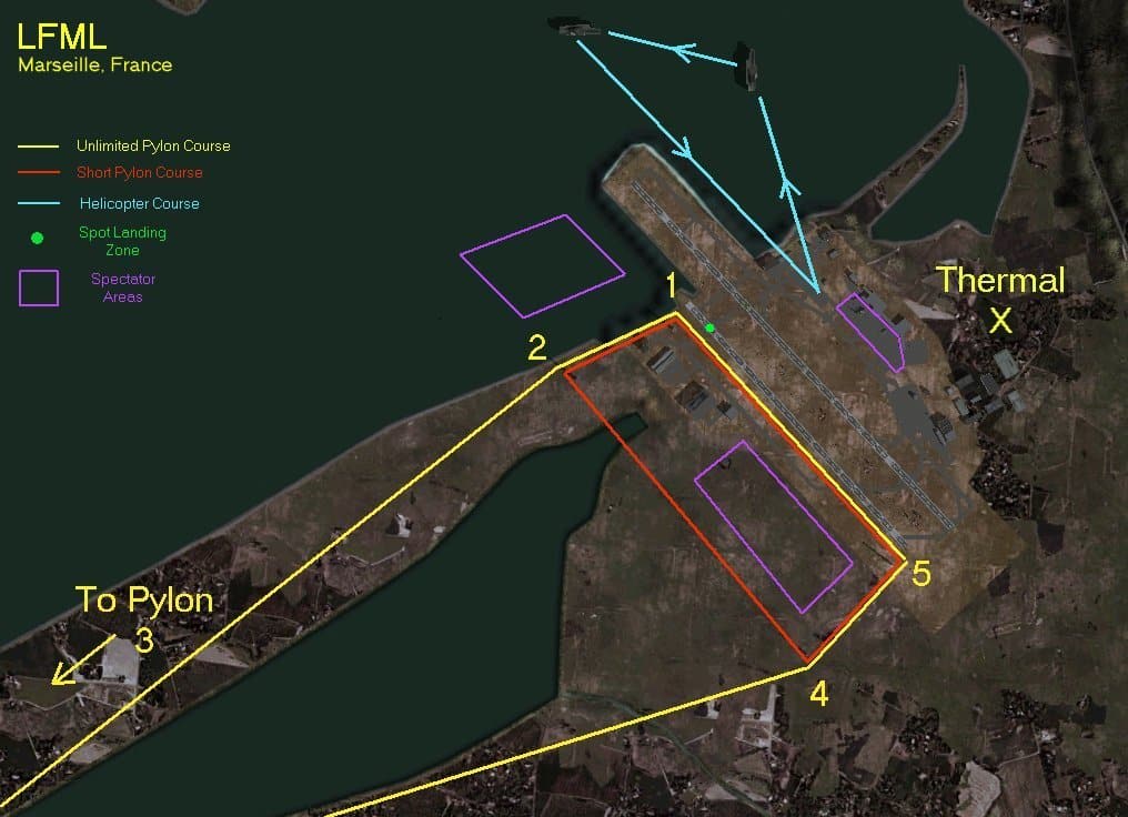 FS2004 Flying Competition Scenery. Located at LFML, Marseille, France, this scenery contains challenges for single and multiplayer flight. Includes two pylon racing courses, a helicopter racing course, a thermal for sailplane races, and flaming hoops to test your piloting skills. By Ian Radcliffe. 649K