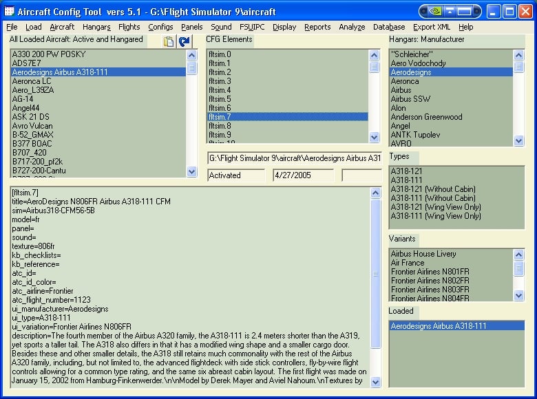 FS2004 FS2002 Aircraft Config tool version 5.1 shareware FlightSim tool with Aircraft, Panel, Flight, Sound, FS cfg editor, Database Viewer for internet FS Addon’s and Hangar Managernow activates/hangars single livery/variant whether you use ‘real’ exterior directories as hangars or use the default \aircraft directory as your ‘virtual’ hangar. Also compatible with FS2002. 5.1 has an improved registration process. 1.5MB