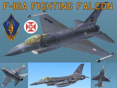 FS2004 General Dynamics F-16A Fighting Falcon Package – . These 4 models represents, the F-16A with the s/n 15108 of the 201th Sq – “Falcons”, of the Portuguese Air Force, stationed at Monte Real Air Base. The package includes Eric Marciano’s F-16 panel Original model by Kirk Olsson Repaint by João Corredeira. 17.1MB