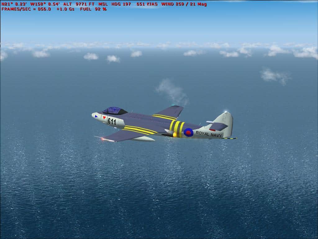 FS2004 Hawker Sea Hawk Update. This is an update of a Hawker Sea Hawk (here). The only reference with this aircraft is a .com web site that cannot be found. I have changed the positions of the wing tip lights and the two beacons. I also changed the smoke effects and afterburners so they are more the size for the aircraft. I have fixed the wheels so the nose wheel does not burry itself in the ground, and I have updated the flight dynamics. Bob Chicilo. 108K