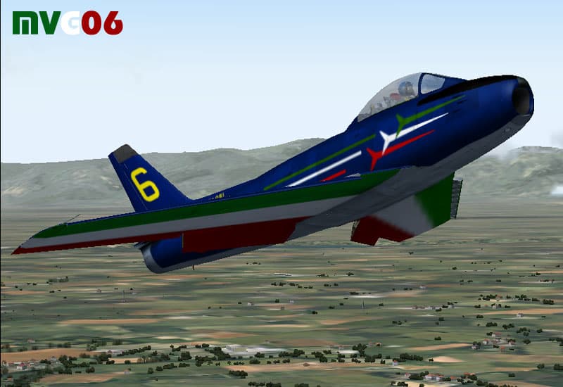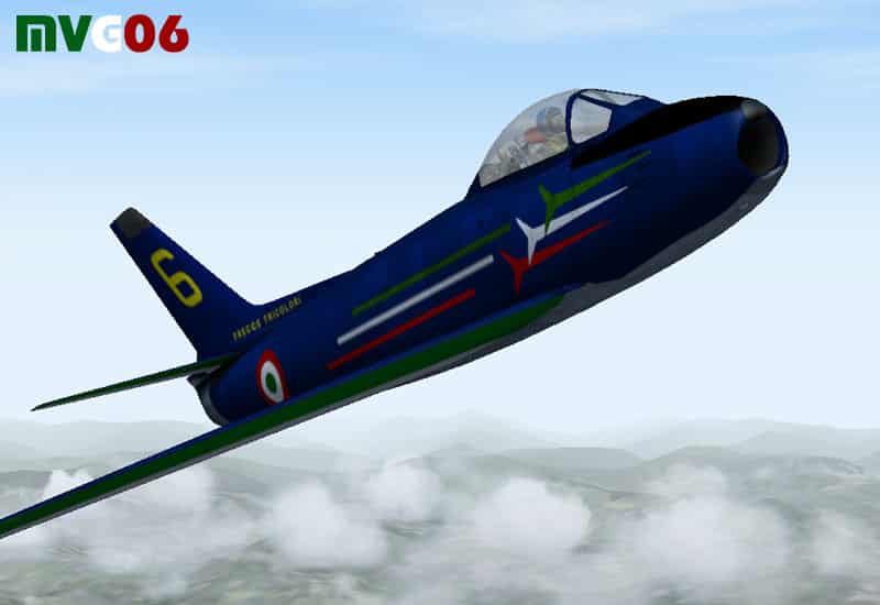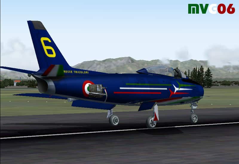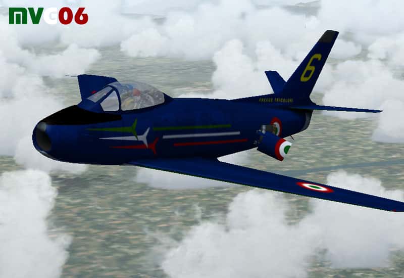 FS2004 Italian Air Force, North American F-86E/Canadair CL-13 MkIV, “Frecce Tricolori” Aerobatic Team, (Final livery) Textures only for an aircraft belonged to “Frecce Tricolori” Aerobatic Team (313Grp., Rivolto, Italy 1961). These textures require the FREEWARE original aircraft package by Kirk Olsson (sabrejet.zip here). Installation instructions are included. Repaint by Manuele Villa. 3MB