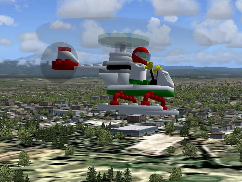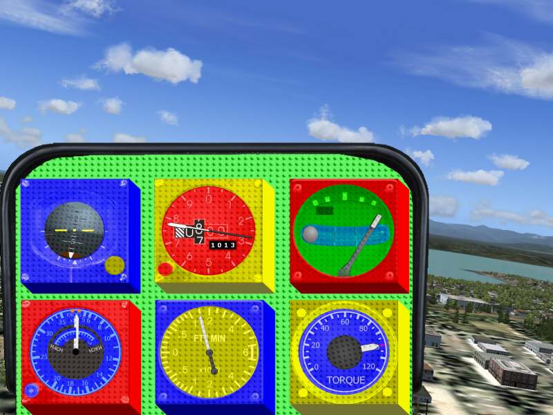 FS2004 Lego Panel. This is a 2D panel for the Lego Stunt Copter by Mark Walsh (above). I created it as a ‘bit of fun’ and posted it on the screenshots forum. After several requests for it, I decided to upload. I hope the vivid colours don’t give you a headache!! I think I’ve now been kicked out of Simshed! Created by Jim Cooper. 1MB