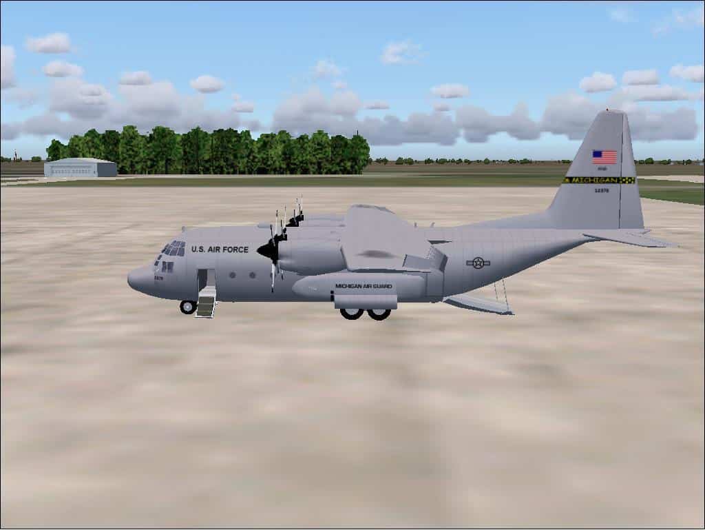 FS2004 Michigan Air National Guard C-130 Textures only. Repaint of Mike Stone’s C-130 for FS2004 (sc130h.zip available here ) in 191st AS, 127th WG, Michigan Air National Guard colors. Aircraft (#12370) is based at Selfridge ANGB, MI. Textures only, requires original model. Repaint By Matt Magner. 1.3MB