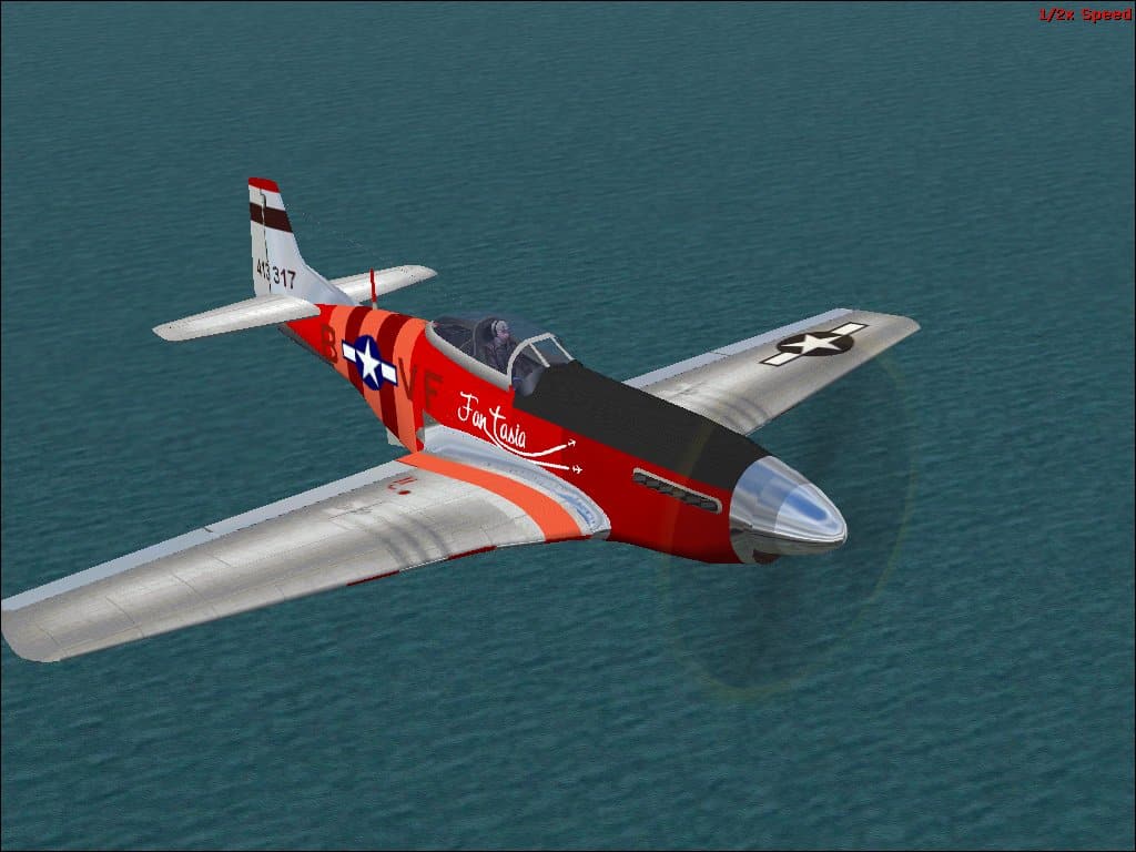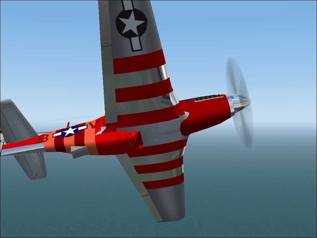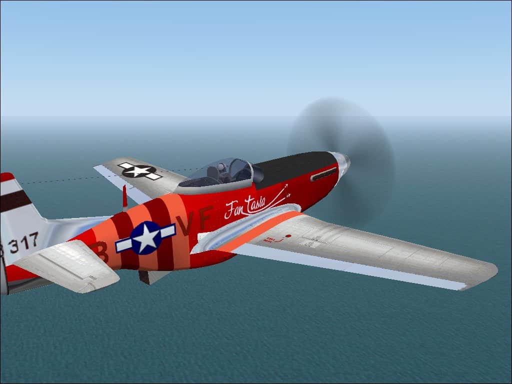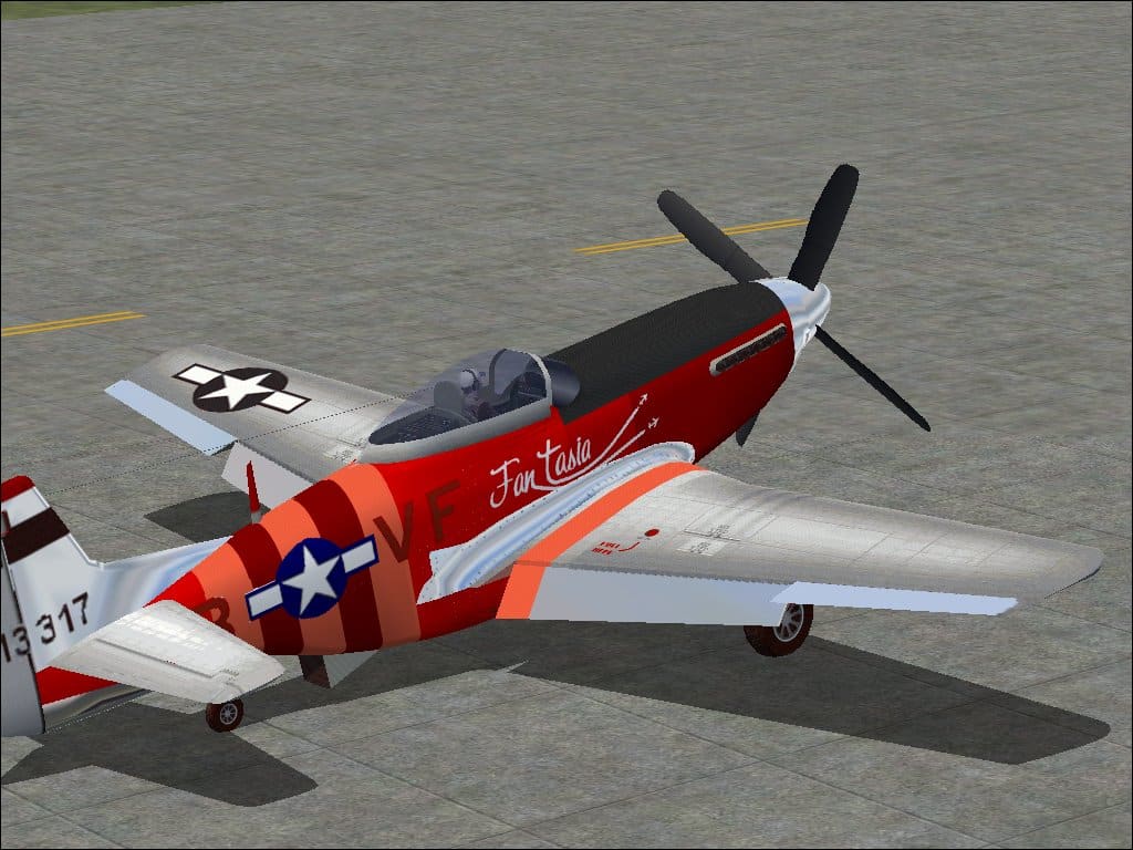 FS2004 P-51D “Fantasia”. This one of my favourites in my virtual hangar. The conmbination of chrome and lots of red looks great… I think. ‘Fantasia’ is what the name implies, a fantasy livery. I created it a few weeks ago and have already flown it from Hong Kong to Manila (just over an hour) WITHOUT speeding up the simulator (ie. REAL time). For those who want to try this flight, take off and land VHHH rwy 07L and take off and land Manila’s RPLL rwy 06. This Mustang has real serial number 413317. The Mustang is at present in the Royal Airforce Museum in Hendon north London England. Please email a ine of thanks to the author of the model who deserves most of the credit. That is I Robert Hawk. Repaint by Francis F. Silva. 4.5MB