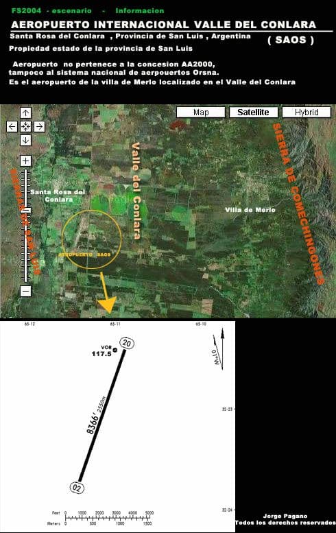 FS2004 Santa Rosa de Conlara International Airport, Argentina ( SAOS ).It is the airport of Villa de Merlo resort town , located in San Luis Province .Built in a valley surrounded by mountains. it is a completely new airport , opened in 2001 and despite its size and traffic it has a telescopic passenger bridge.New AFCAD2 and new Landclass.By Jorge Pagano. 1.4MB