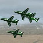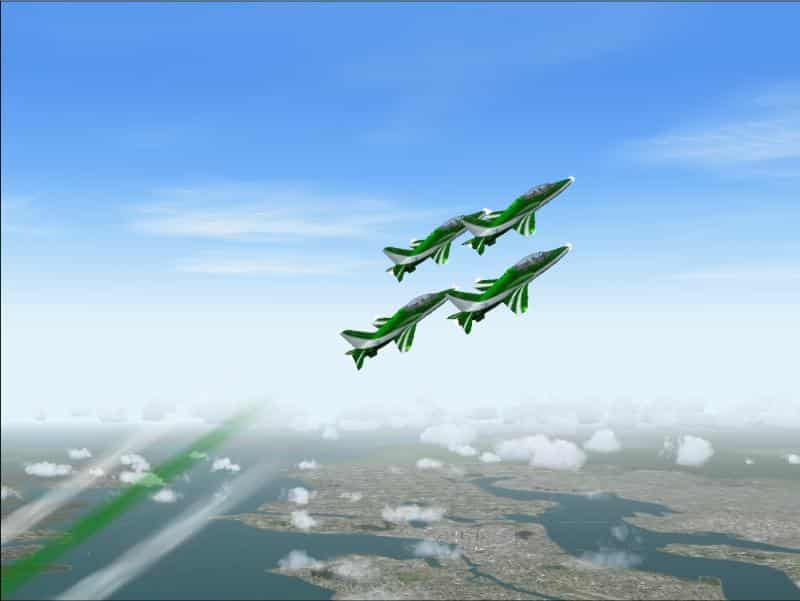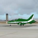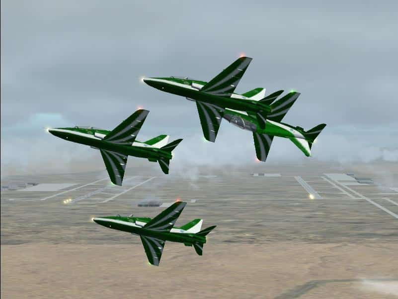 FS2004 ‘Saudi Hawks’ Single and Four Compatibility Update Requires the FS2002 files SHAWKS1.ZIP and SHAWKS4.ZIP, which represent aircraft of the Royal Saudi Air Force’s Display Team, the “Saudi Hawks”. This small modification updates the panels for use in FS2004 of both the FSDS single and GMAX animated formation four BAe Hawk aircraft. By Mark Beaumont. File name: SH_FS9.ZIP. 304K ** see panel fix below