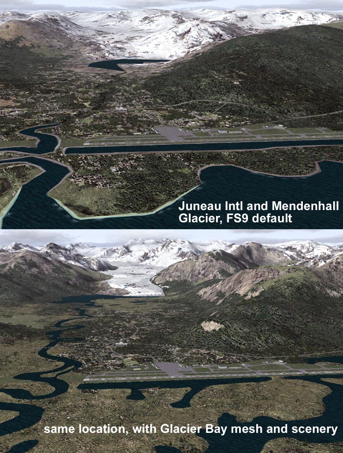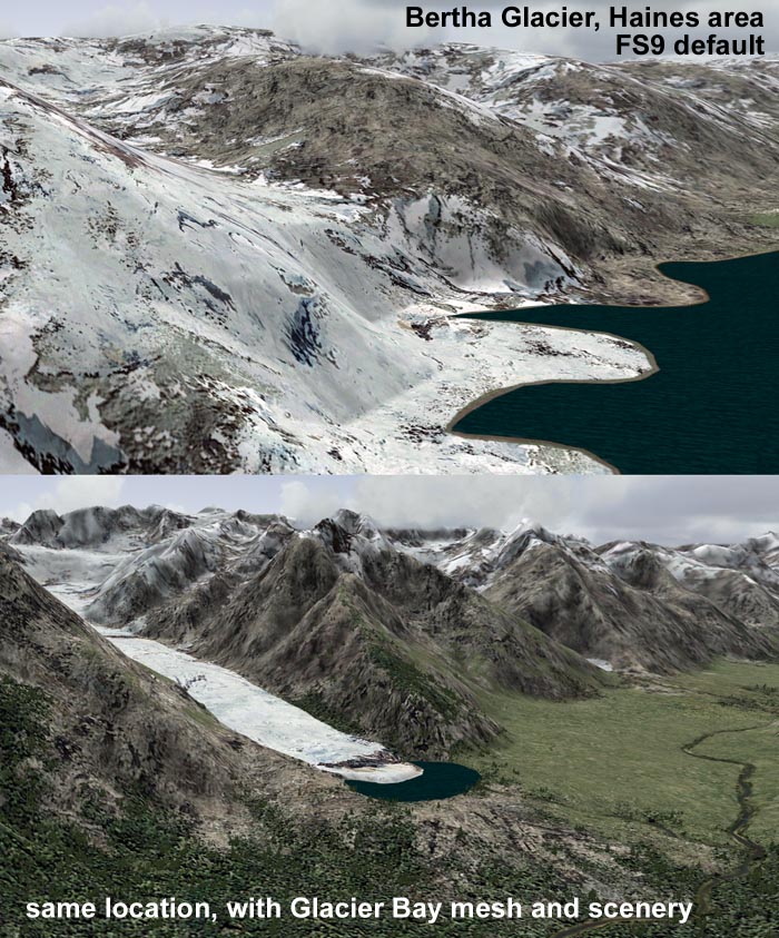 FS2004 Scenery Enhancements and Terrain Mesh of Glacier Bay National Park, Alaska Add-on meshes can greatly improve the detail of the FS terrain but often conflict with the inaccurate placement of the other default FS landscape elements, particularly in coastal and mountainous areas. This project showcases new methods and software that allow for semi-automated development of FS landscapes from accurate source data. The files completely replace the default FS landscape of Southeast Alaska’s Glacier Bay National Park and the adjacent Lynn Canal area between Juneau and Skagway (N58-60 W134-138), including shorelines, islands, and lakes, as well as glaciers, landclass, man-made features, and a LOD9 (76-m) terrain mesh. Optional AI floatplane traffic at four seaplane bases is included. A LOD10 (38-m) mesh of the same area is available as a separate optional download. FS2002 users please use fs8glbay.zip instead. By Holger Sandmann and Jim Keir. 25.6MB