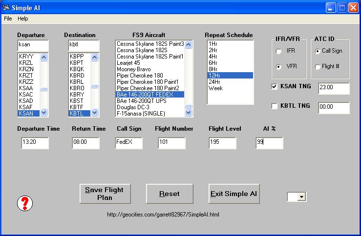FS2004 Simple AI v. 1.06. AI Air Traffic Creation Program. I created this program for my own personal use because it was tedious to enter and edit flight plans by hand. This simple and easy to use utility will create departure and return flights from any default FS2004 airports and use any of the planes you have installed(correctly). The programs works very well, as simple as it is but I plan on future enhancements. by: Garrett Hardesty. 1.6MB