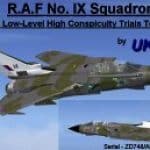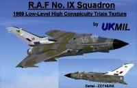 FS2004 Tornado GR1 RAF 9 SQN High Conspicuity Trials c.1989 Textures only. This pack includes textures for ZD748 of the RAF’s 9 Squadron High Conspicuity Trails c.1989. The textures are full textures for IRIS/DSB Tornado GR4 here Textures by Jason Sparkes of UKMIL. 3.2MB