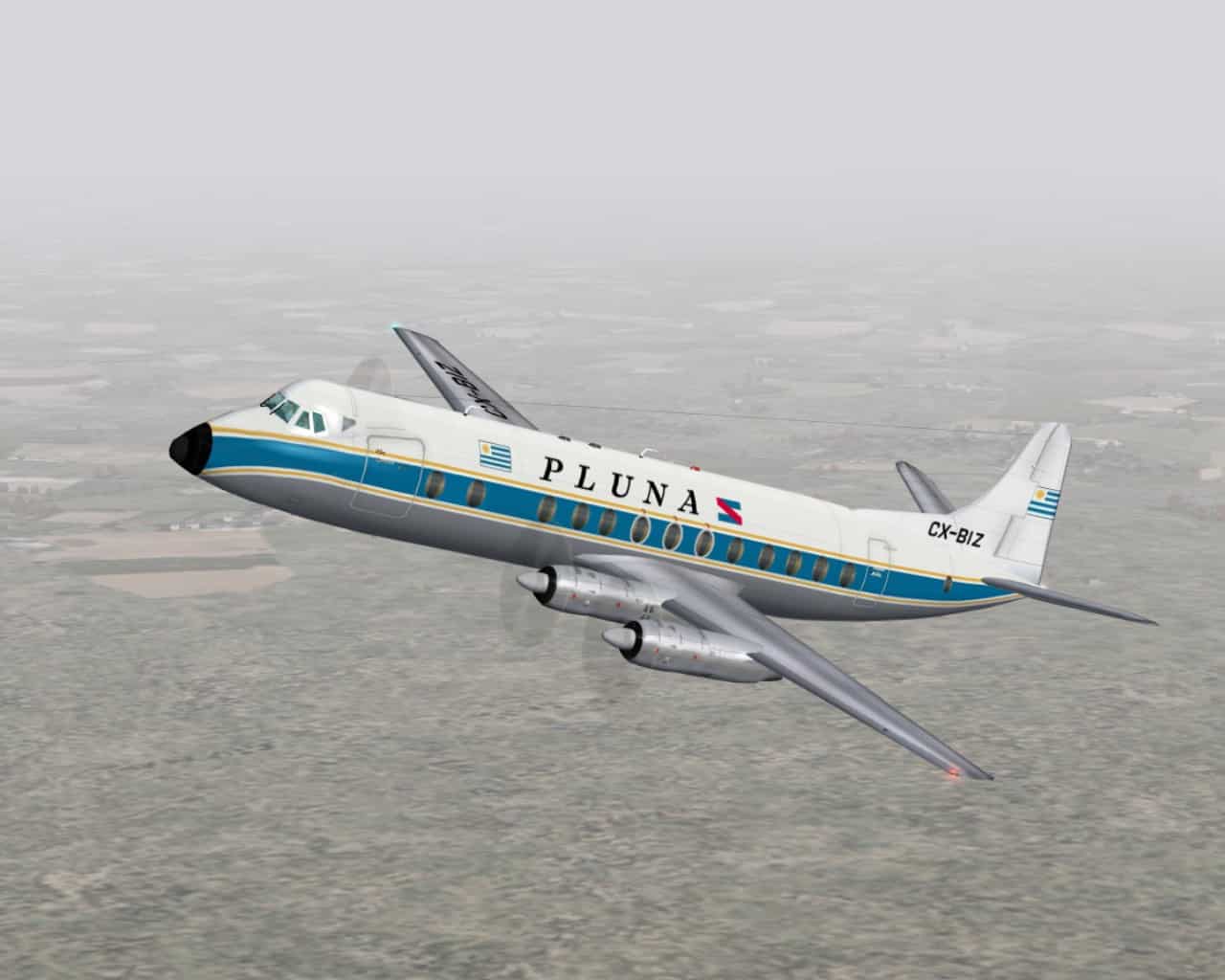 FS2004 Viscount 827 PLUNA Textures only. This aircraft was the Prototype V.810 and after type certification it became a testbed for the Vanguard. Fitted at one time with a Vanguard tailplane section in place of the fin, it was restored and converted to production standard as a type 827 for VASP. Later it was one of three V.827 aircraft sold by VASP to PLUNA (Primera Línea Uruguaya de Navegación Aérea), the national airline of Uruguay who used it until withdrawl at Montivideo in 1986 Requires the FSDS Viscount 800 model by Rick Piper here Repaint by Garry Russell. 1.1MB