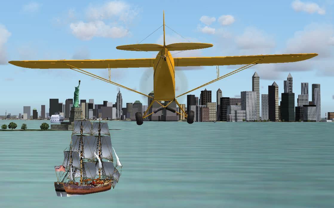 FS2004/2002 HM Bark Endeavour In New York Harbour. All new GMAX model.. Auto installer places the Endeavour South West of the Statue of Liberty in New York. By Mike Hill. 763K