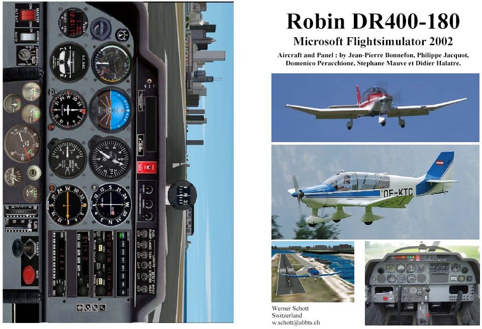 FS2002 Manual/Checklist Robin DR400-180. In PDF-format as a booklet. From “cold” – Pre Start – Startup – Before Taxi – Taxi – Before Takeoff – Takeoff – Climb Out – Cruise – Descent – Approach – Landing – Taxi To Ramp – Shutdown – Securing Aircraft – to “cold”. Based on the Robin DR400-180 aircraft and panel by the “zeteam” : Jean-Pierre Bonnefon, Philippe Jacquot, Domenico Peracchione, Stephane Mauve and Didier Halatre. Freeware by Werner Schott. 474K