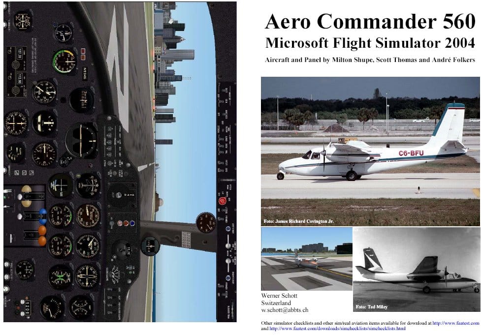 FS2004 Manual/Checklist — Aero Commander 560. FS2004 Manual/Checklist Aero Commander 560. In PDF-format as a booklet. From “cold” – Pre Start – Startup – Before Taxi – Taxi – Before Takeoff – Takeoff – Climb Out – Cruise – Descent – Approach – Landing – Taxi To Ramp – Shutdown – Securing Aircraft – to “cold”. Based on the “Aero Commander 560” aircraft and panel by Milton Shupe, Scott Thomas and André Folkers. Freeware by Werner Schott. 647K