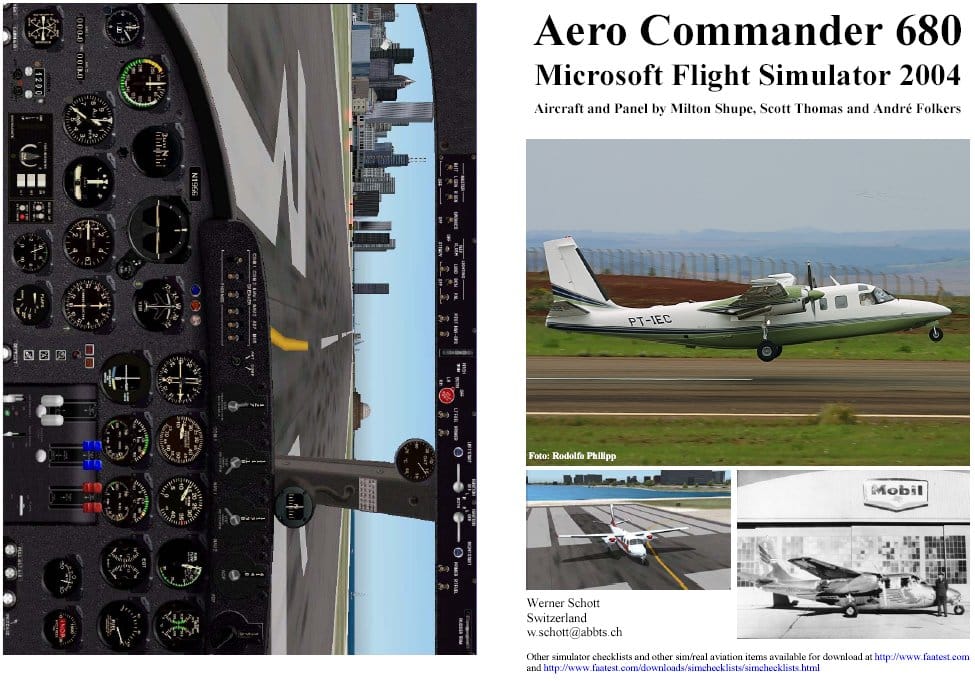 FS2004 Manual/Checklist — Aero Commander 680. FS2004 Manual/Checklist Aero Commander 680. In PDF-format as a booklet. From “cold” – Pre Start – Startup – Before Taxi – Taxi – Before Takeoff – Takeoff – Climb Out – Cruise – Descent – Approach – Landing – Taxi To Ramp – Shutdown – Securing Aircraft – to “cold”. Based on the “Aero Commander 680” aircraft and panel by Milton Shupe, Scott Thomas and André Folkers. Freeware by Werner Schott. 1.7MB