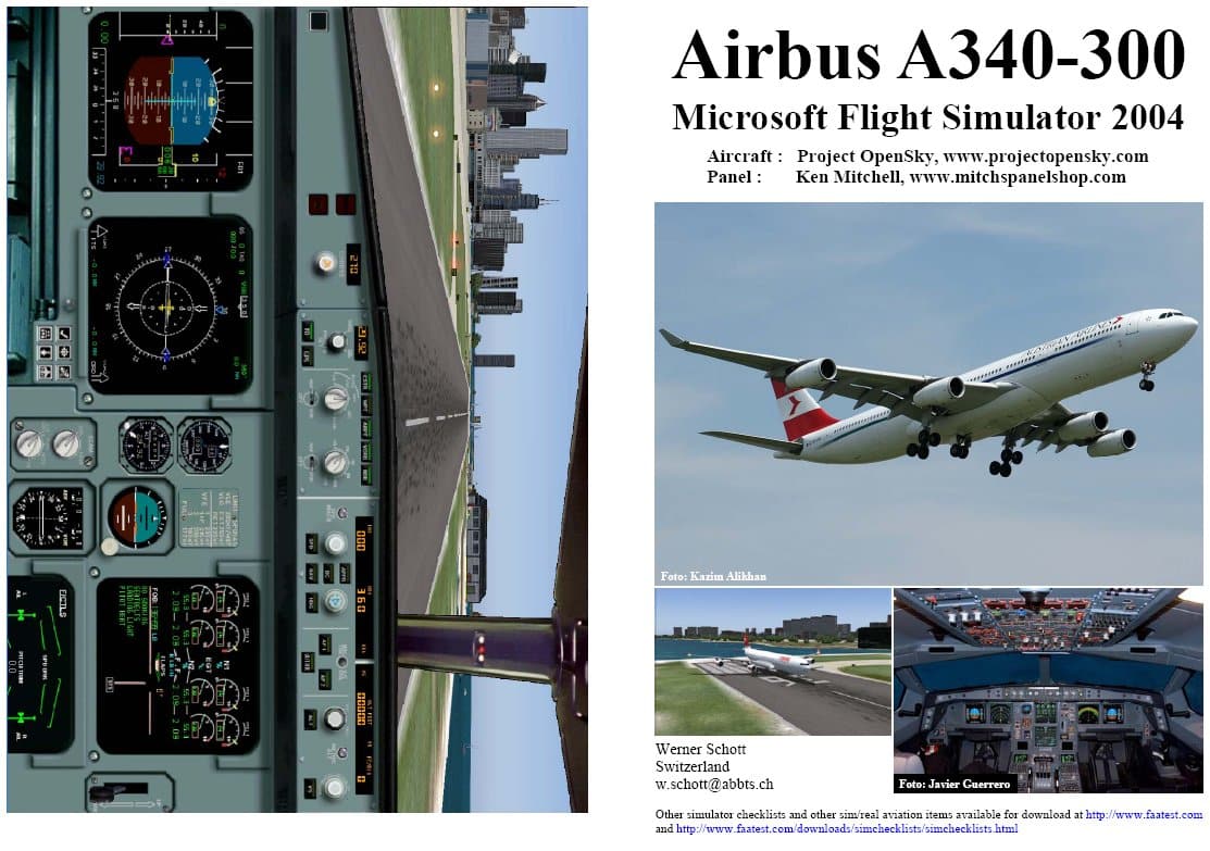 FS2004 Manual/Checklist — Airbus A340-300. FS2004 Manual/Checklist Airbus A340-300. In PDF-format as a booklet. From “cold” – Pre Start – Startup – Before Taxi – Taxi – Before Takeoff – Takeoff – Climb Out – Cruise – Descent – Approach – Landing – Taxi To Ramp – Shutdown – Securing Aircraft – to “cold”. Based on the “Airbus A340-300” aircraft by Project OpenSky (POSKY) and panel by Ken Mitchell. FS2002 version had more than 5200 downloads. Freeware by Werner Schott. 1.6MB