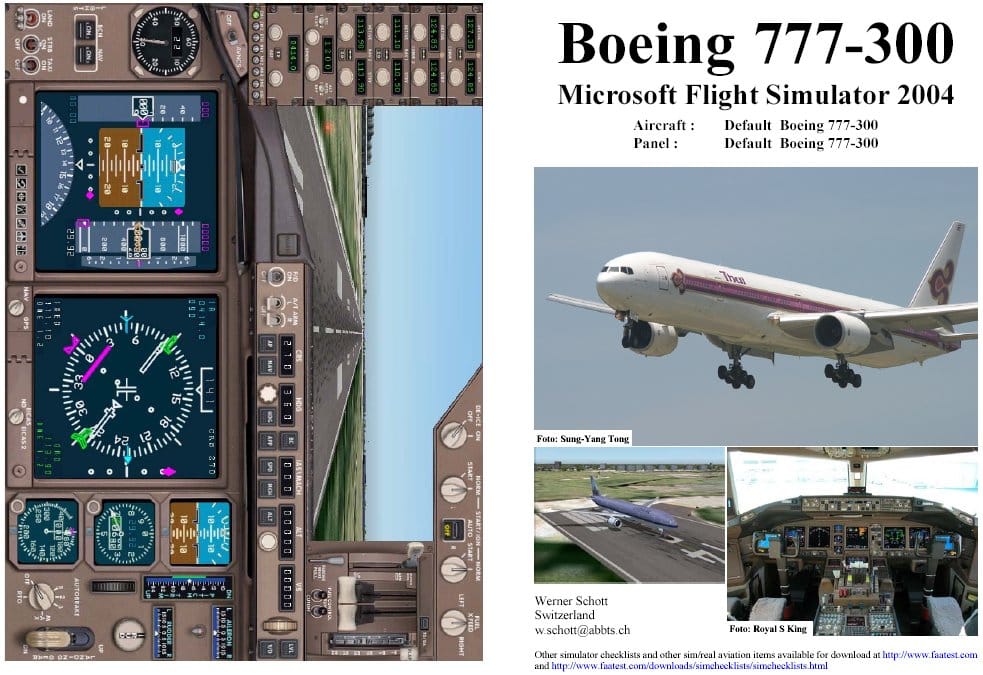 FS2004 Manual/Checklist — Default B-777-300. FS2004 Manual/Checklist Default B-777-300. In PDF-format as a booklet. From “cold” – Pre Start – Startup – Before Taxi – Taxi – Before Takeoff – Takeoff – Climb Out – Cruise – Descent – Approach – Landing – Taxi To Ramp – Shutdown – Securing Aircraft – to “cold”. FS2002 version had more than 5700 downloads. Freeware by Werner Schott. 1MB