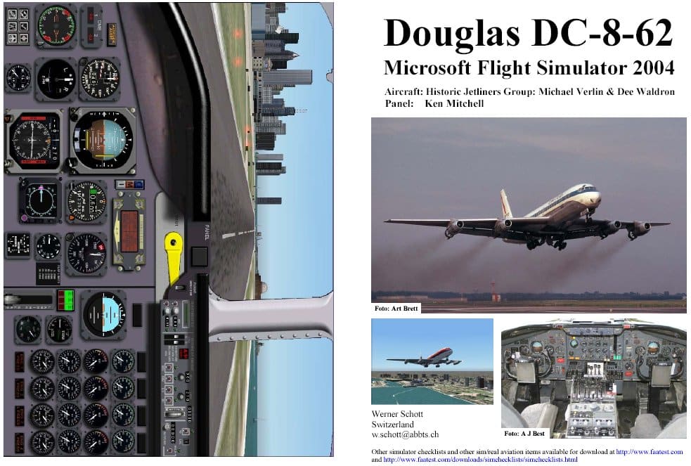 FS2004 Manual/Checklist Douglas DC-8-62. In PDF-format as a booklet. From “cold” – Pre Start – Startup – Before Taxi – Taxi – Before Takeoff – Takeoff – Climb Out – Cruise – Descent – Approach – Landing – Taxi To Ramp – Shutdown – Securing Aircraft – to “cold”. Based on the “Douglas DC-8-62” aircraft by Historic Jetliners Group (FSDS 2.24 model by Dee Waldron; flight dynamics, master textures, night lighting and paint by Michael Verlin) and panel by Ken Mitchell. FS2002 version had more than 2000 downloads. Freeware by Werner Schott. 624K