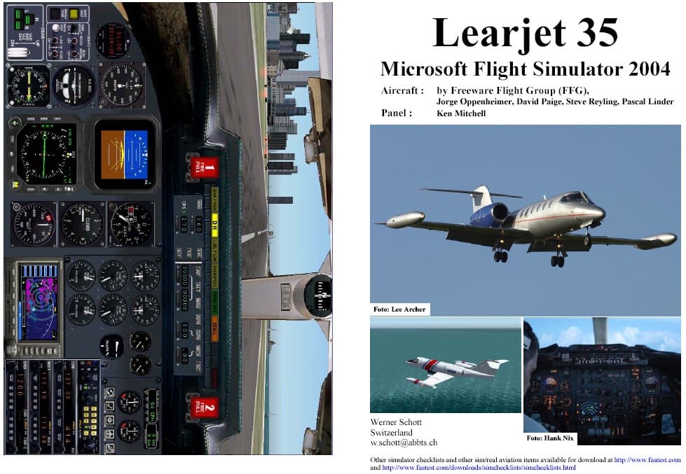 FS2004 Manual/Checklist Learjet 35. In PDF-format as a booklet. From “cold” – Pre Start – Startup – Before Taxi – Taxi – Before Takeoff – Takeoff – Climb Out – Cruise – Descent – Approach – Landing – Taxi To Ramp – Shutdown – Securing Aircraft – to “cold”. Based on the “Learjet 35” aircraft by Freeware Flight Group (FFG: Jorge Oppenheimer, David Paige, Steve Reyling, Pascal Linder) and panel by Ken Mitchell. FS2002 version had more than 2500 downloads. Freeware by Werner Schott. 1MB