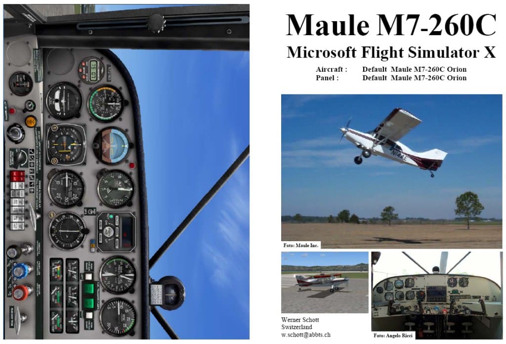 FSX Manual/Checklist Default Maule M7-260C Orion. In PDF-format as a booklet. From “cold” – Pre Start – Startup – Before Taxi – Taxi – Before Takeoff – Takeoff – Climb Out – Cruise – Descent – Approach – Landing – Taxi To Ramp – Shutdown – Securing Aircraft – to “cold”. By Werner Schott. 483K