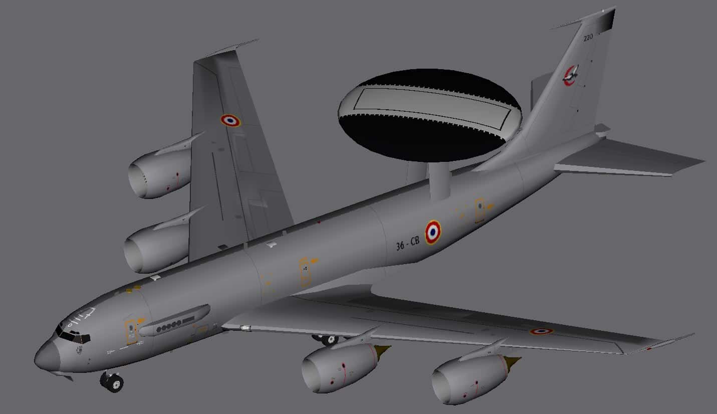 This is the FSX E-3 Sentry Static Plane. There are 3 models of the Sentry: US, Britain and France. The Sentry can be placed in any scenery by any object placement tool. It comes also as MDL files. The Sentry comes from the GMax site as a free plane but was remodelled in GMax by Guy Diotte. The textures are also by Guy Diotte.