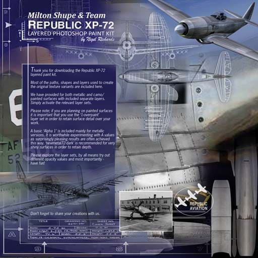 Republic XP-72_paintkit By Nigel Richards for the Republic XP-72 by Milton Shupe & team 15/06/2014 ———————————————————– Fully layered 2048 x 2048 files for complete access to all model’s texture surfaces (includes camo and weathering). Access the full range of layers – add, subtract or vary all elements – rivets, panels, scratches, highlights, weathering, as well as the actual graphics layers for colours, markings etc. So get some good reference pics, fire-up Photoshop and enjoy going creative for YOUR Republic XP-72 paint schemes. And remember; FS is for sharing – and we’d love to see the results of YOUR work. Enjoy being creative – have fun! Nigel