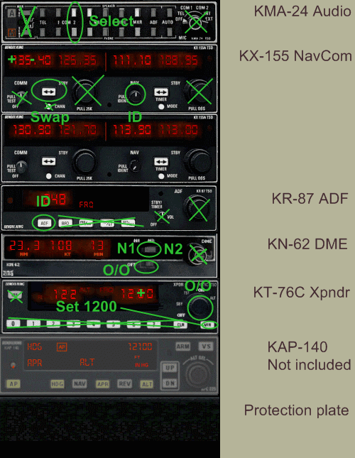 For FS2004 and FSX including NAV-COM KX-155 (1&2), KR-87 ADF, KN-62 and KN-63 DME (to give the choice) , KT-76C XPNDR , KMA- 24 Audio-Selector. The main idea was to replace the common appliances proposed in several default (Cessna, Baron, … ) or third party aircrafts by something esthetically more realistic but without any useless sophistication. By Pierre Fasseaux