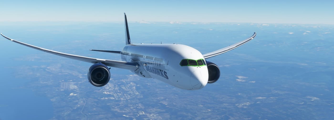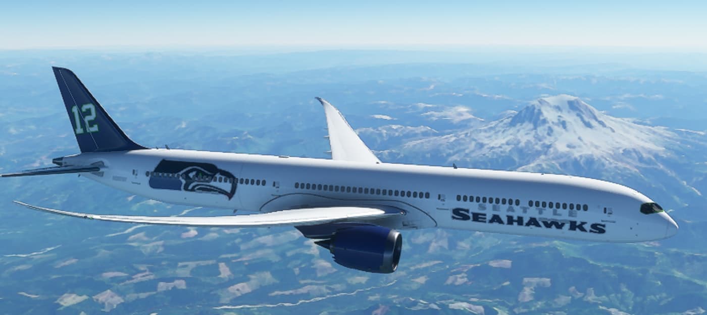 MSFS Seattle Seahawks Boeing 787 Livery. The design is taken from the 747 livery that Boeing made to celebrate the Seahawks going to the 2014 Superbowl Super Bowl XLVIII. The paint scheme features the Seahawks logo as well as a “12” on the tail, a tip of the hat to the imposing home fans that turn the Seahawks’ stadium into a “twelfth man” on game days.