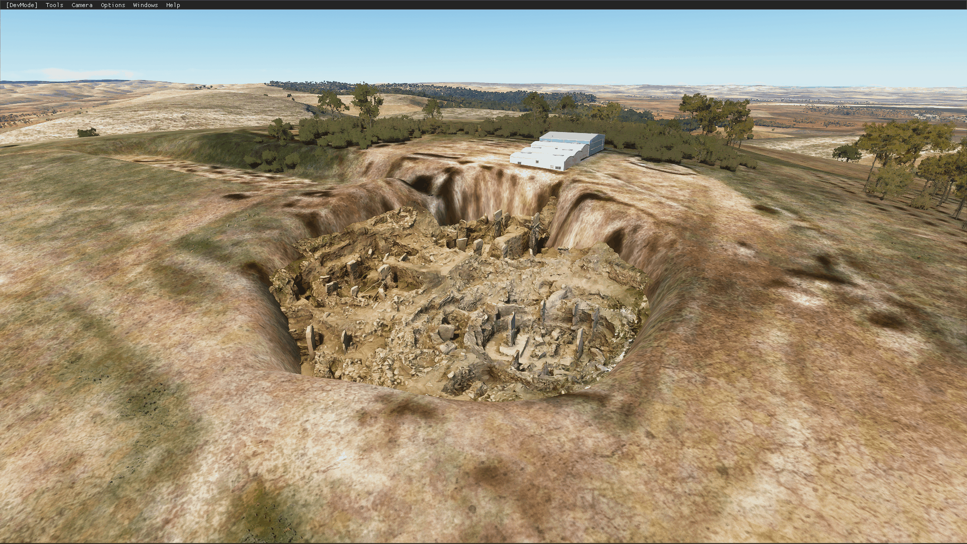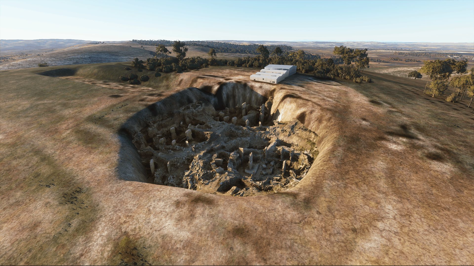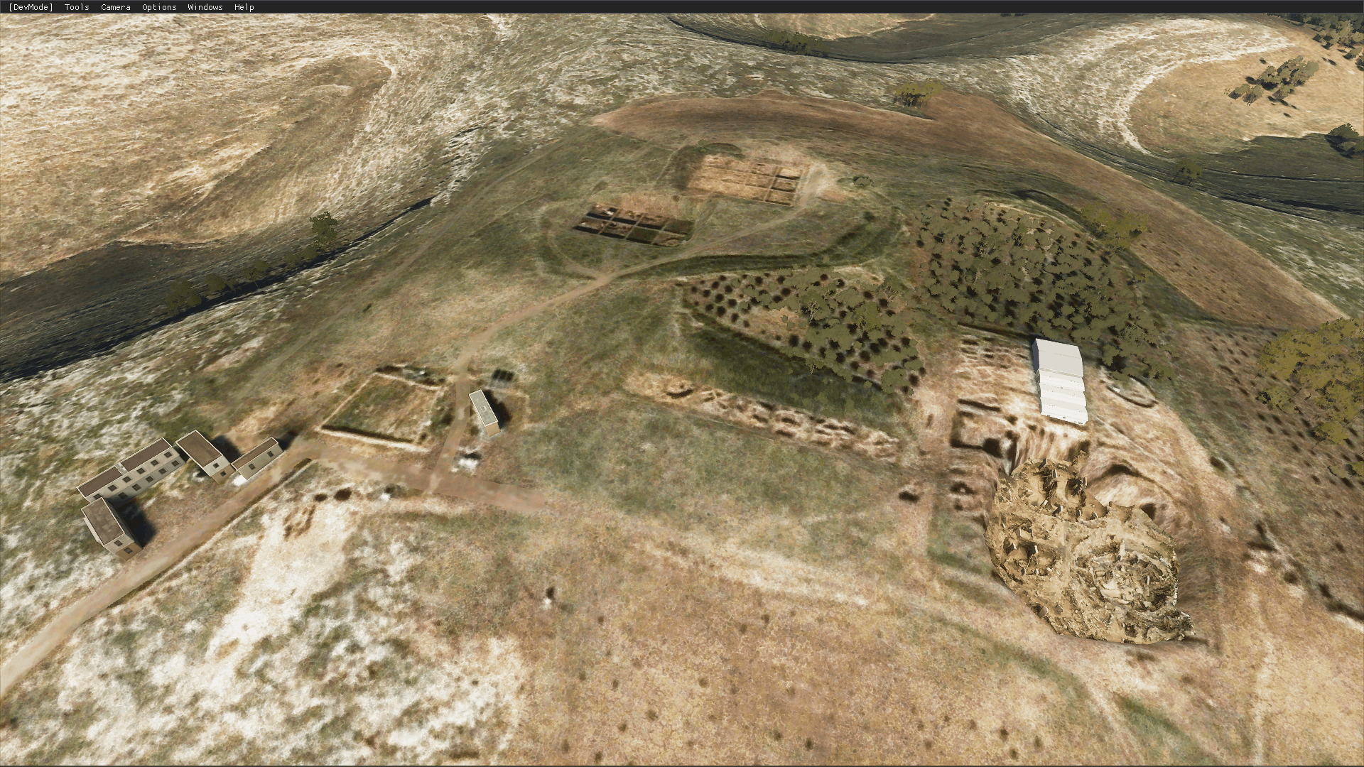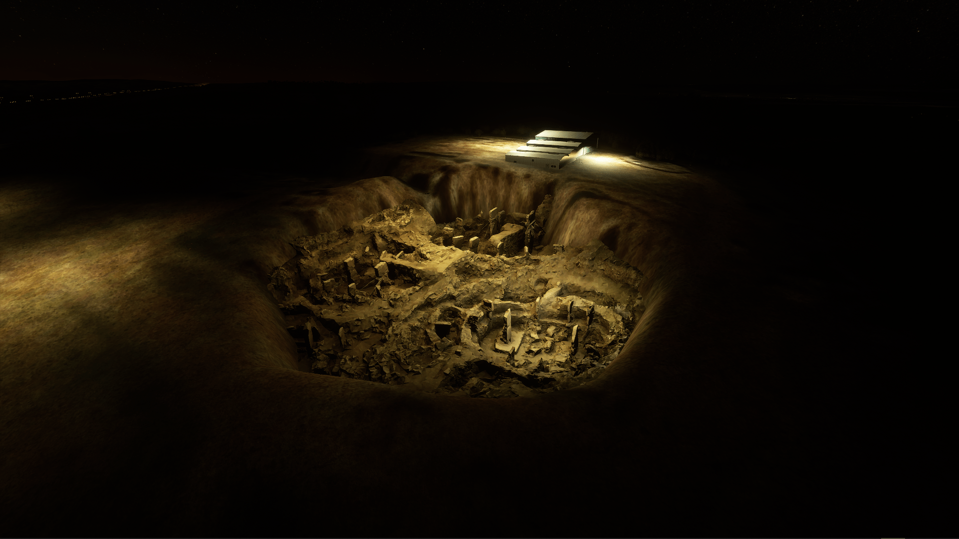 In-game, the stock dig site is auto-rendered as a warehouse and group of buildings. This mod removes the auto buildings, inserts the model in the main dig site, and add some depth to the Bing maps imprint of secondary dig sites. Accent night lighting is also provided.