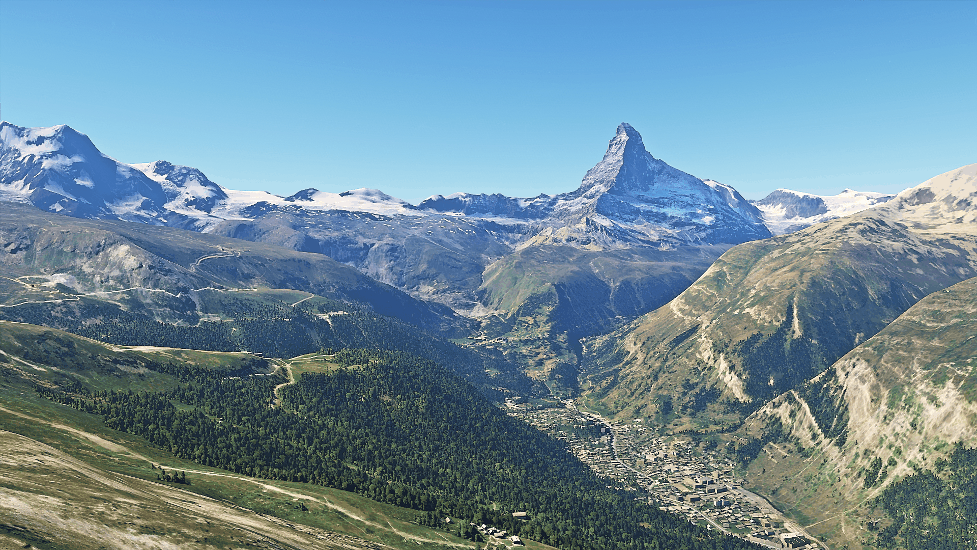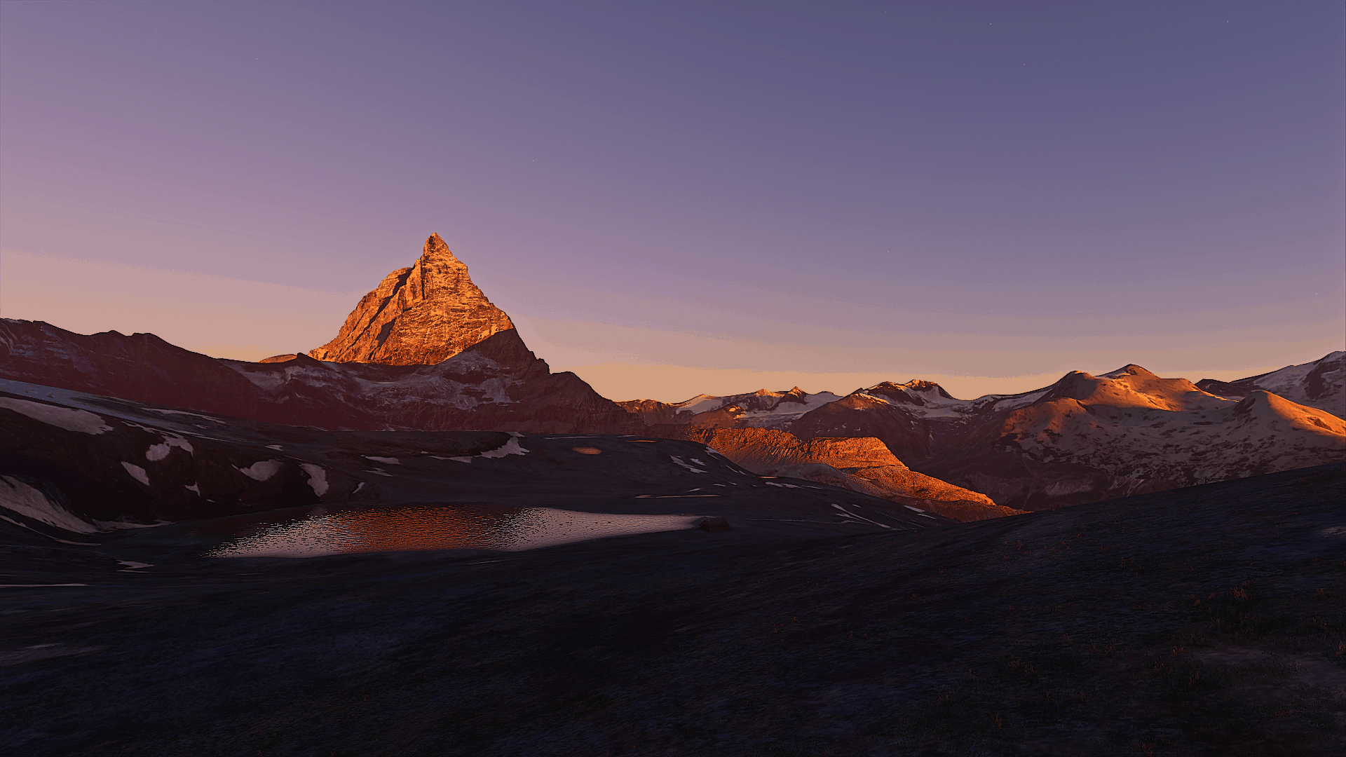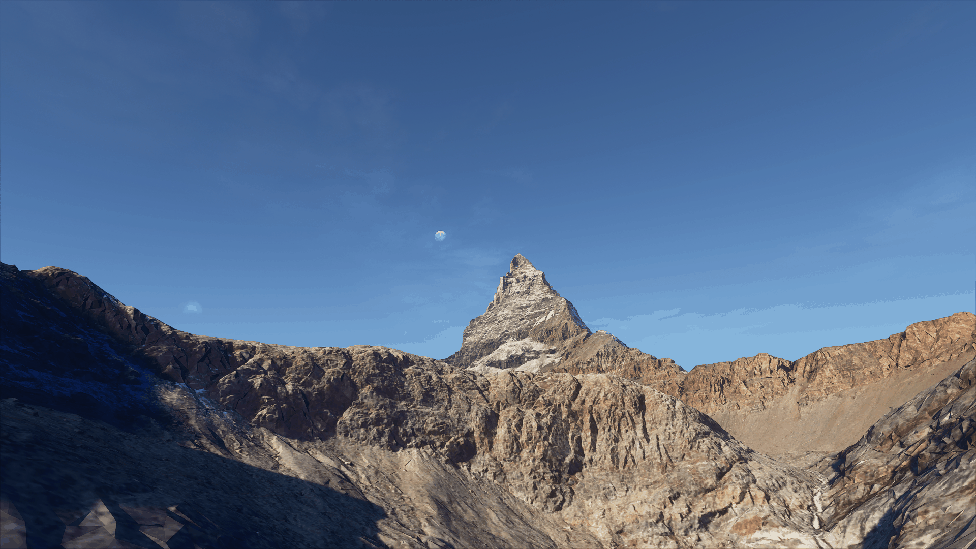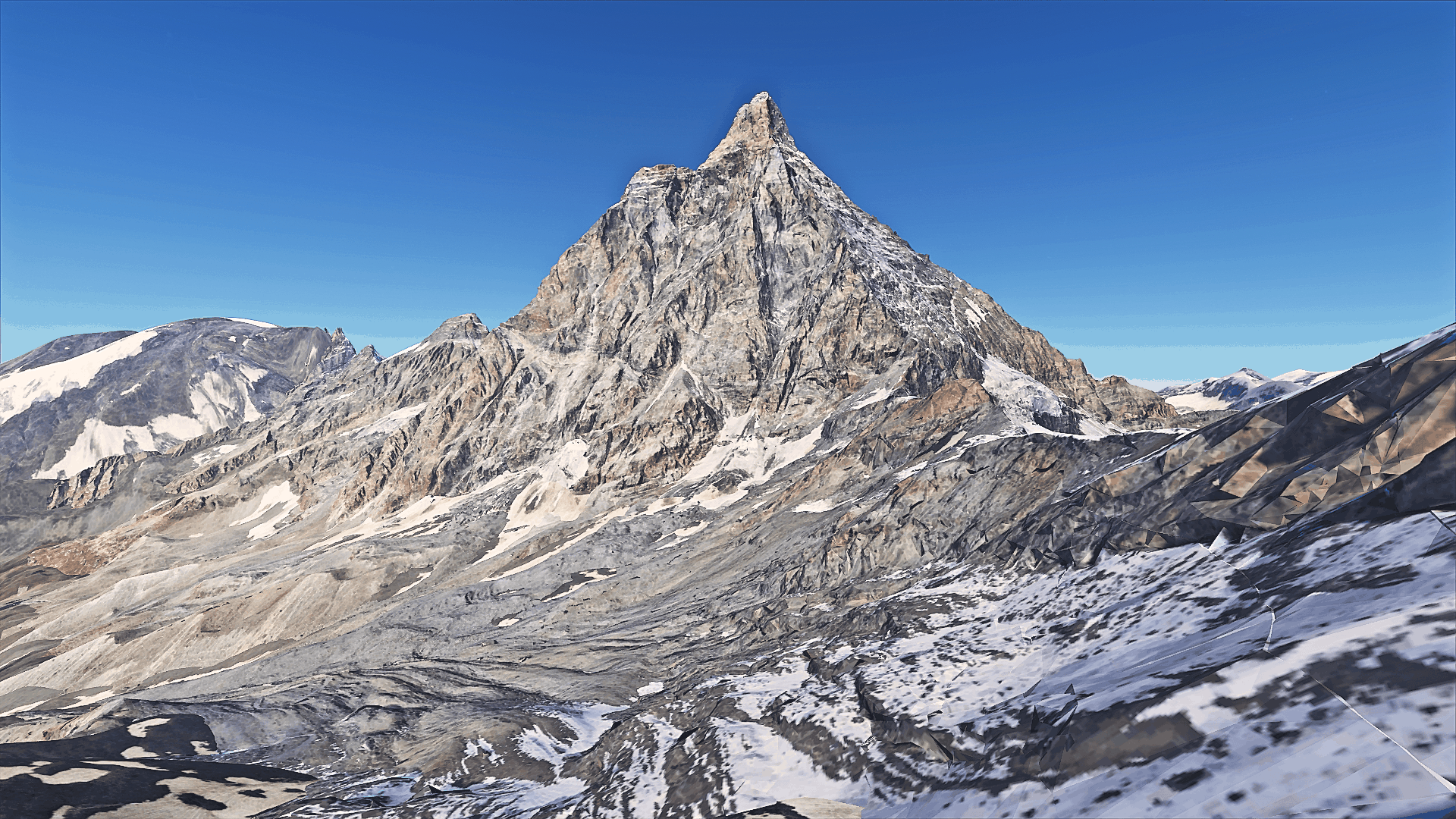 Matterhorn, the Swiss and incredibly photogenic giant. Famous around the world, this mountain is a beauty. That’s why I took the challenge to “renovate” the original one of the game, that looked lacking. Matterhorn figure is very difficult to be interpreted successfully in the sim with low resolution mesh data, it needed a really high resolution model. This is what it is. There are known issues such as : You can pass beneath the artificial ground of the model because the mesh underneath is not accurate,so no collision for the most part. There are also some artifacts at the edges of the scenery(i tried to cover up most of them somehow) and my theory is that they were created during the injection of the model in blender.