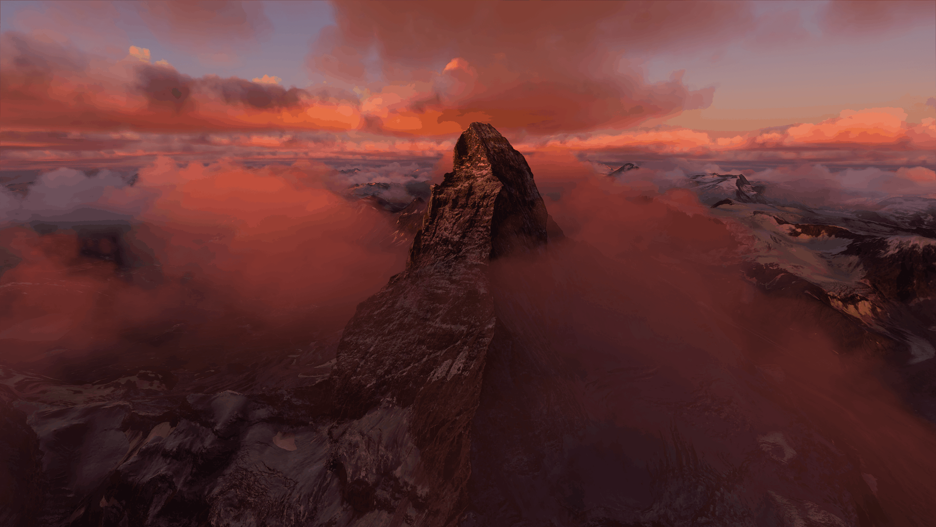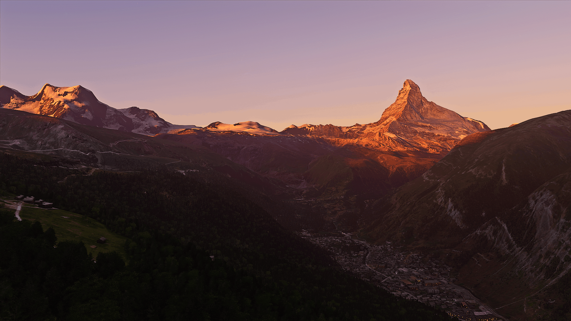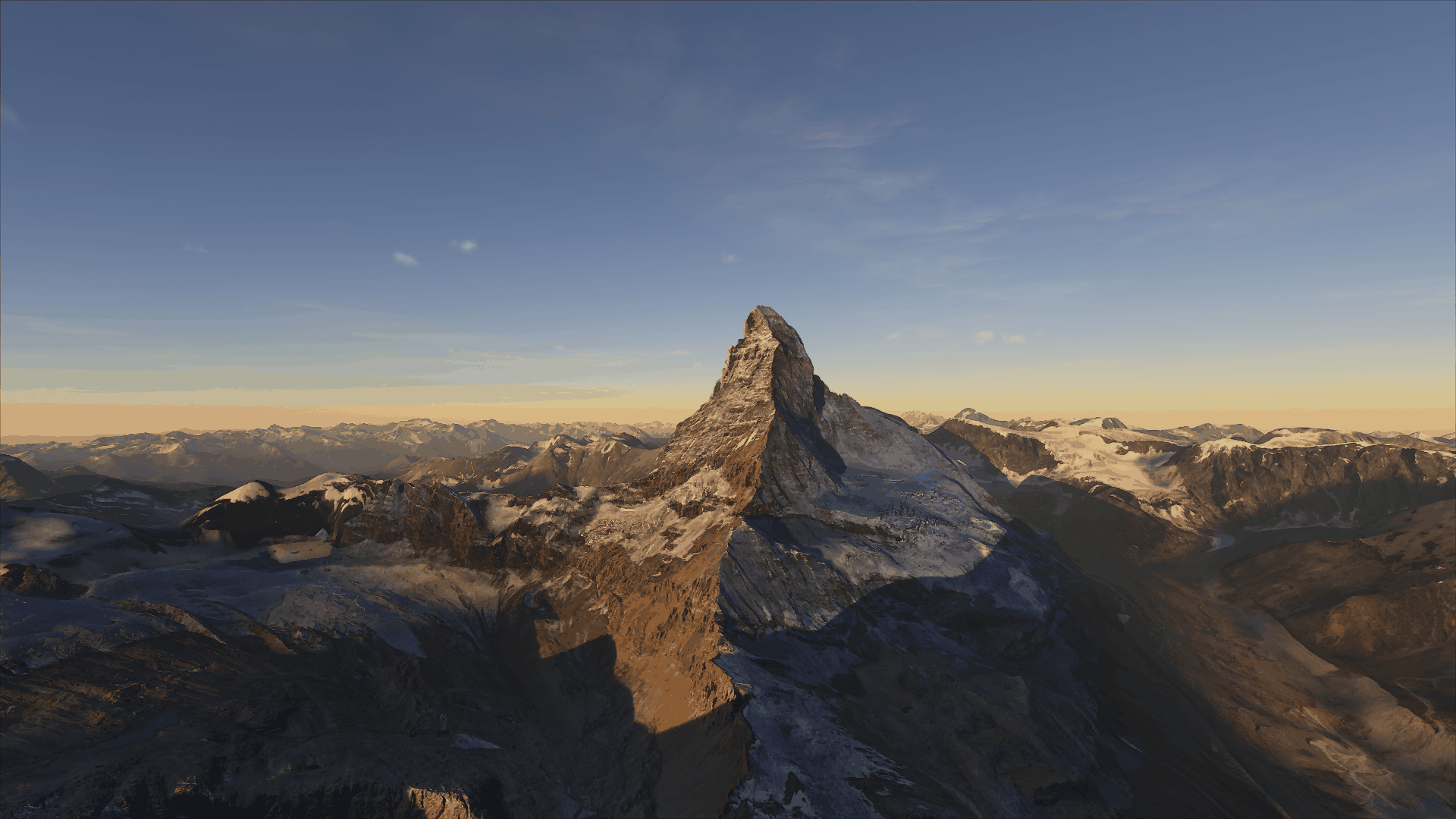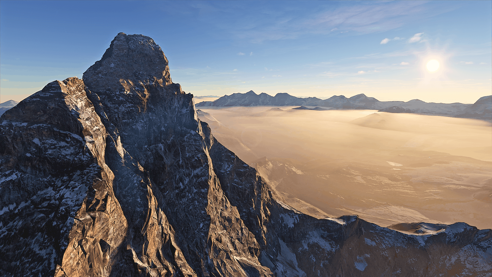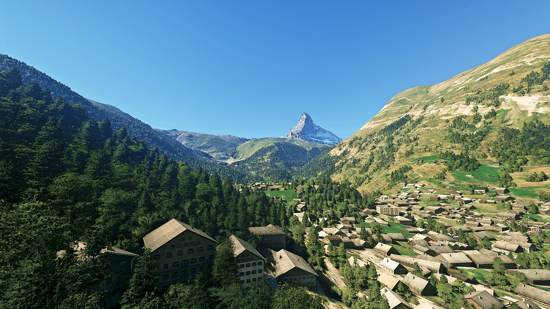 Matterhorn, the Swiss and incredibly photogenic giant. Famous around the world, this mountain is a beauty. That’s why I took the challenge to “renovate” the original one of the game, that looked lacking. Matterhorn figure is very difficult to be interpreted successfully in the sim with low resolution mesh data, it needed a really high resolution model. This is what it is. There are known issues such as : You can pass beneath the artificial ground of the model because the mesh underneath is not accurate,so no collision for the most part. There are also some artifacts at the edges of the scenery(i tried to cover up most of them somehow) and my theory is that they were created during the injection of the model in blender.