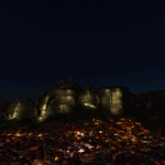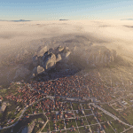 Trivia: The Meteora, Greek: Μετέωρα, is a rock formation in central Greece hosting one of the largest and most precipitously built complexes of Eastern Orthodox monasteries, second in importance only to Mount Athos. The six (of an original twenty four) monasteries are built on immense natural pillars and hill-like rounded boulders that dominate the local area. It is located near the town of Kalambaka at the northwestern edge of the Plain of Thessaly near the Pineios river and Pindus Mountains.Meteora is included on the UNESCO World Heritage List under criteria I, II, IV, V, and VII.The name means “lofty”, “elevated”, and is etymologically related to meteor.*