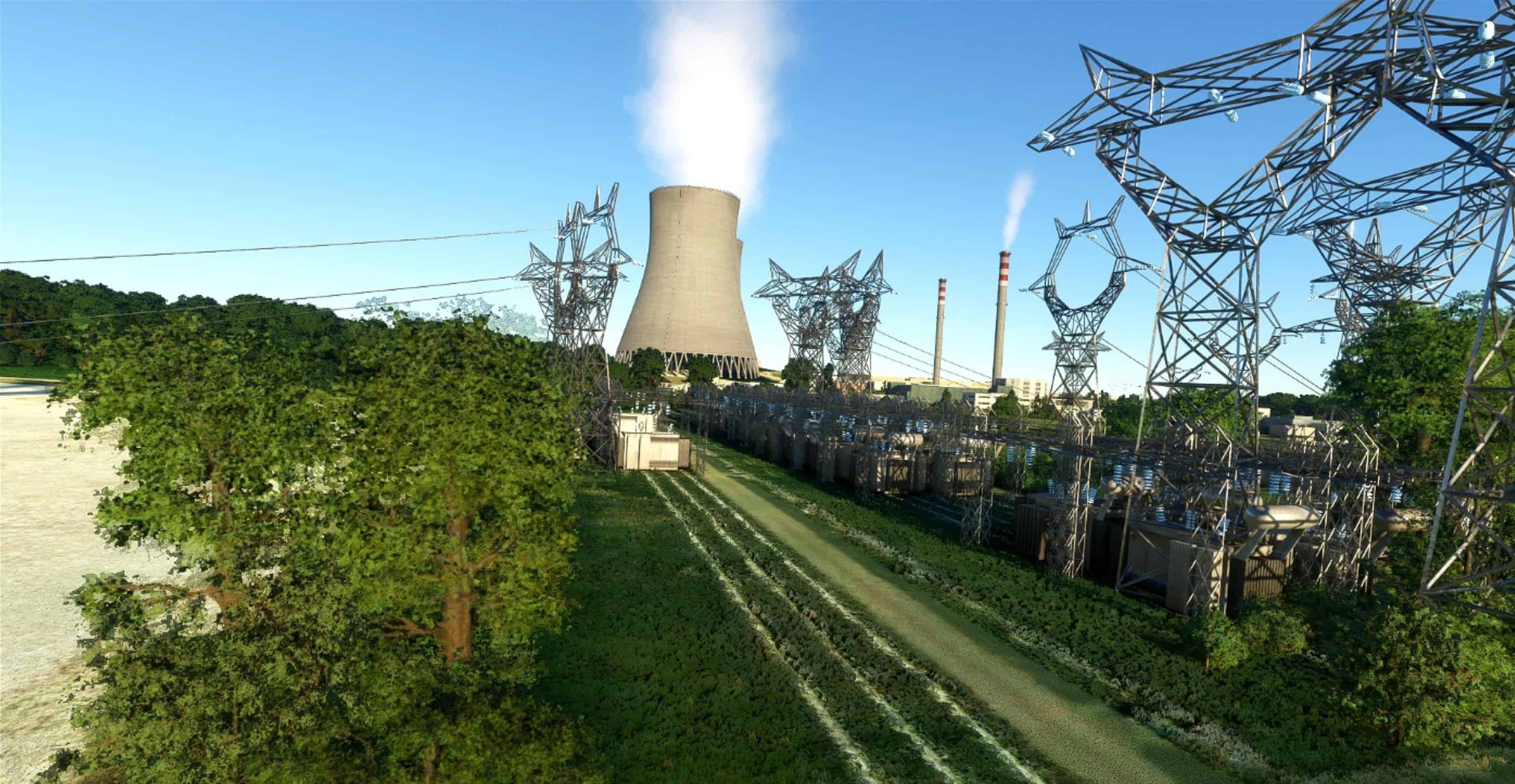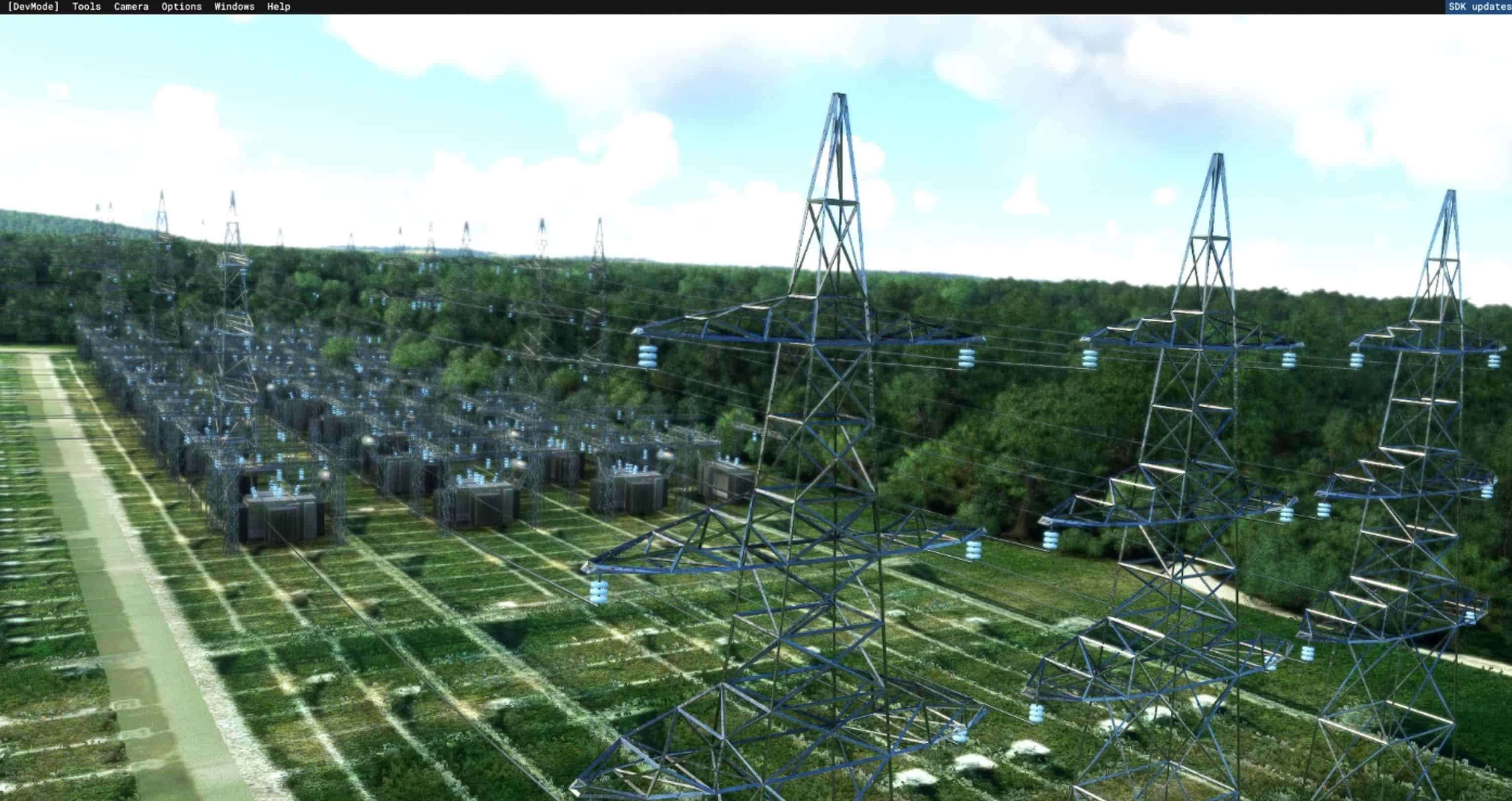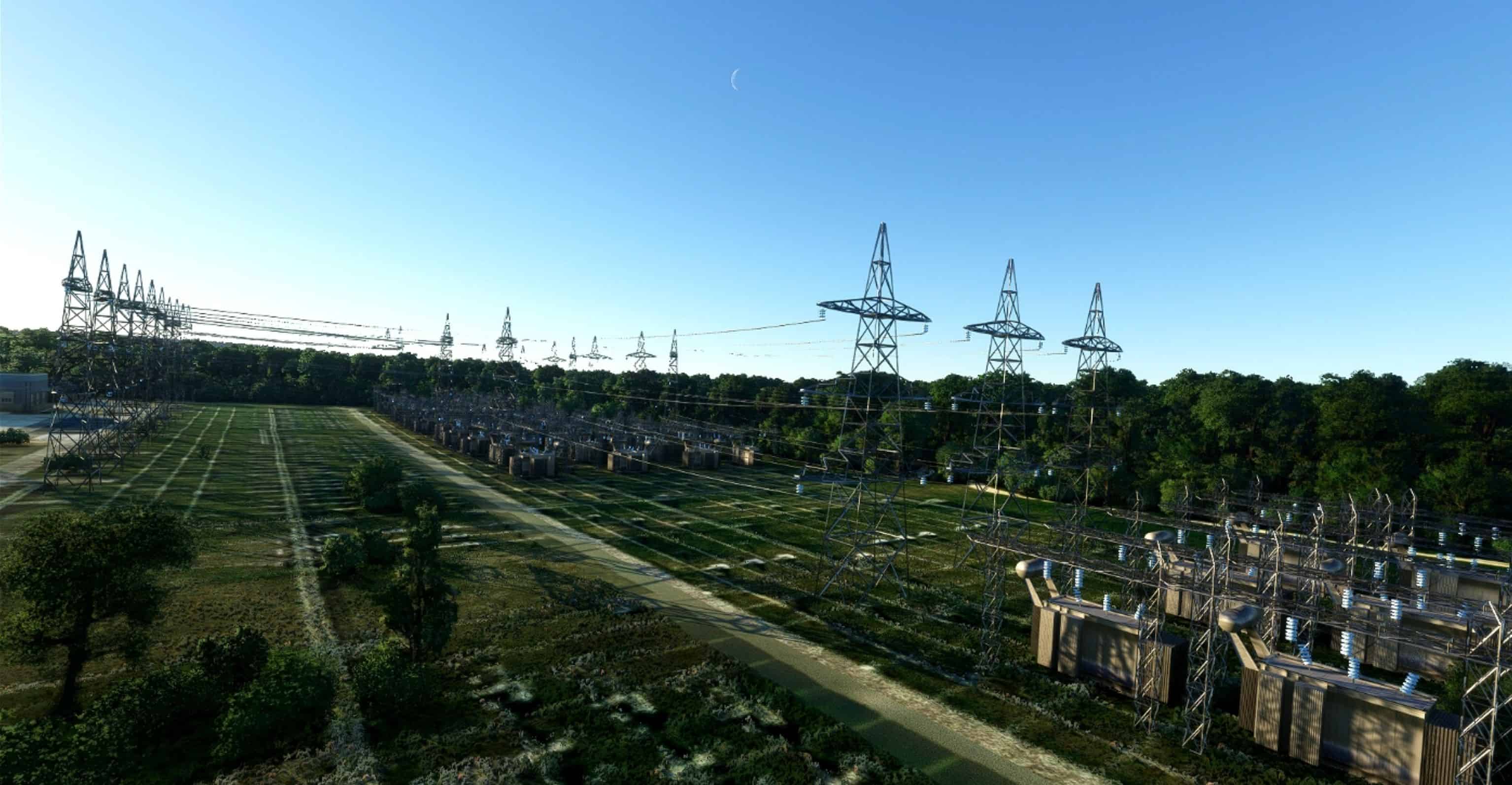 MSFS has powerlines pylons, but no wire between them.