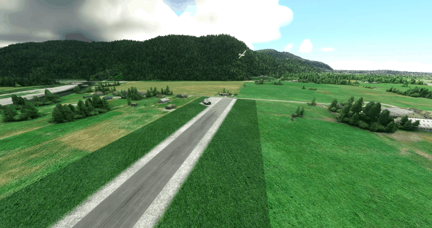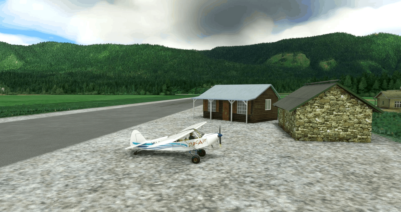 The strip was grass in real life, but I’ve recreated it with a simple asphalt runway, and a couple of buildings, for use in FSEconomy. And of course some parking
