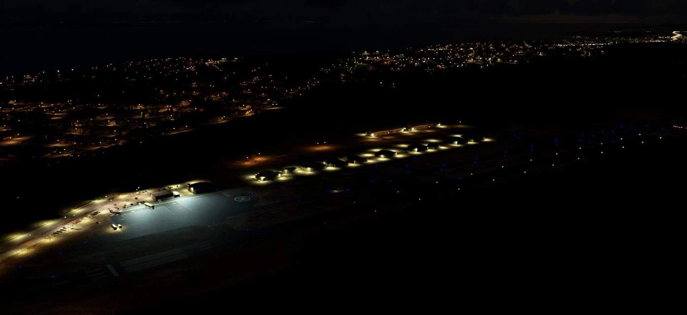 In this scenery I have added some GA parking spots and static planes, static elements, fence, hangars and night lighting.