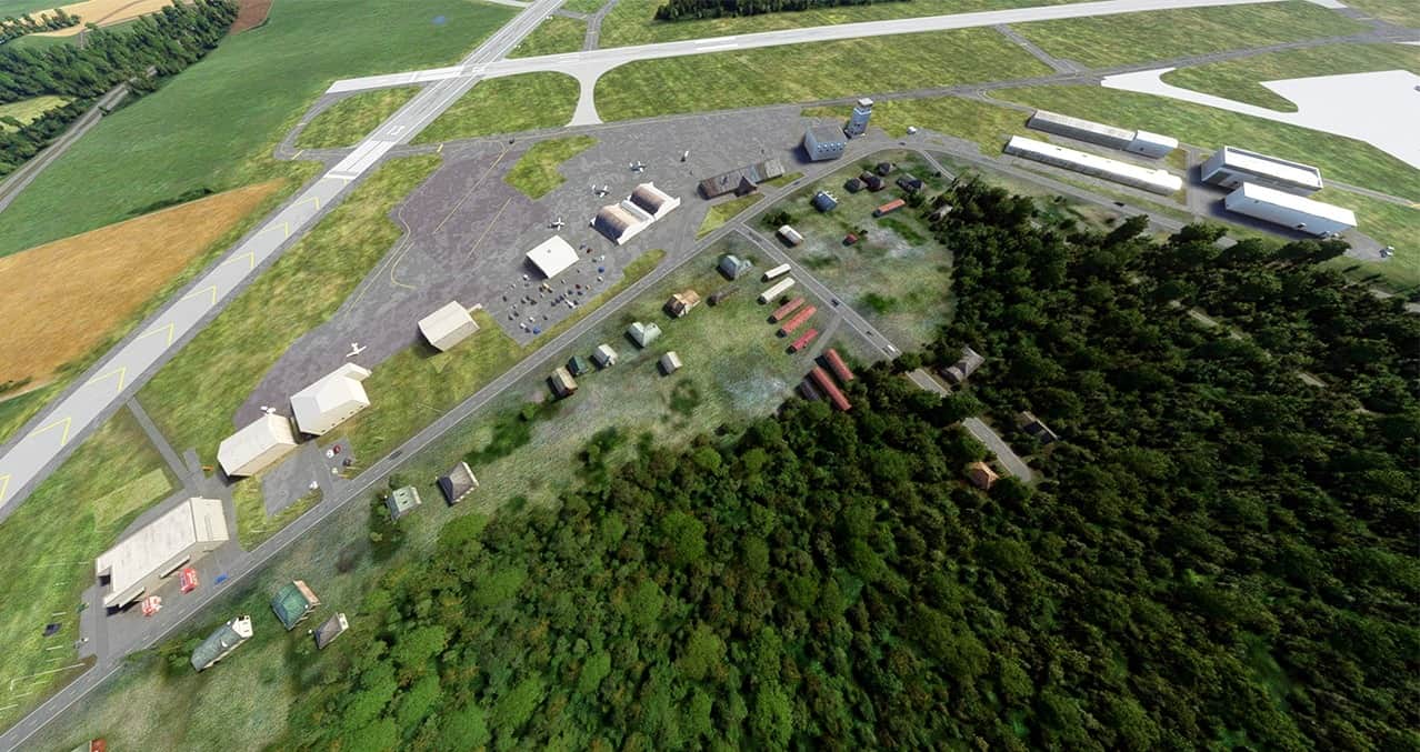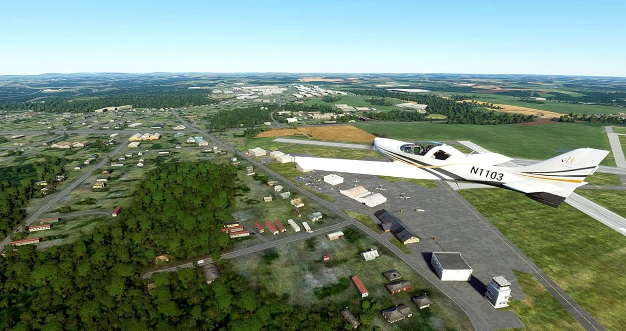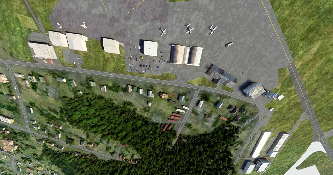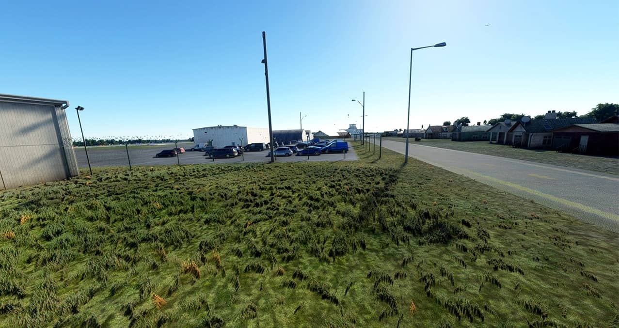 A few days ago I upload this scenery, but was just not satisfied. This is Version 1.1 and many changes and additions, plus one exclusion has been added. I had the location of the terminal building and Averett’s hanger too far to the back. The terminal is actually a drive under and should cross the driveway. I moved Avertt’s hanger, and scaled it down, it was far too big compared to Earth images, and doing so also moved it out of the parking ramps, so that solved my AI problem also. I added street lights and two more flags of prop size at their proper locations. One use to be the hanger that NASCAR driver Ward Burton stored his airplane in, the other at the fire station. I added a few more structures and a fuel farm. And I removed that unsightly beacon tower that KDAN simply does not have. It was blocking part of the street too. There used to be a beacon near the tower, but it’s now gone.