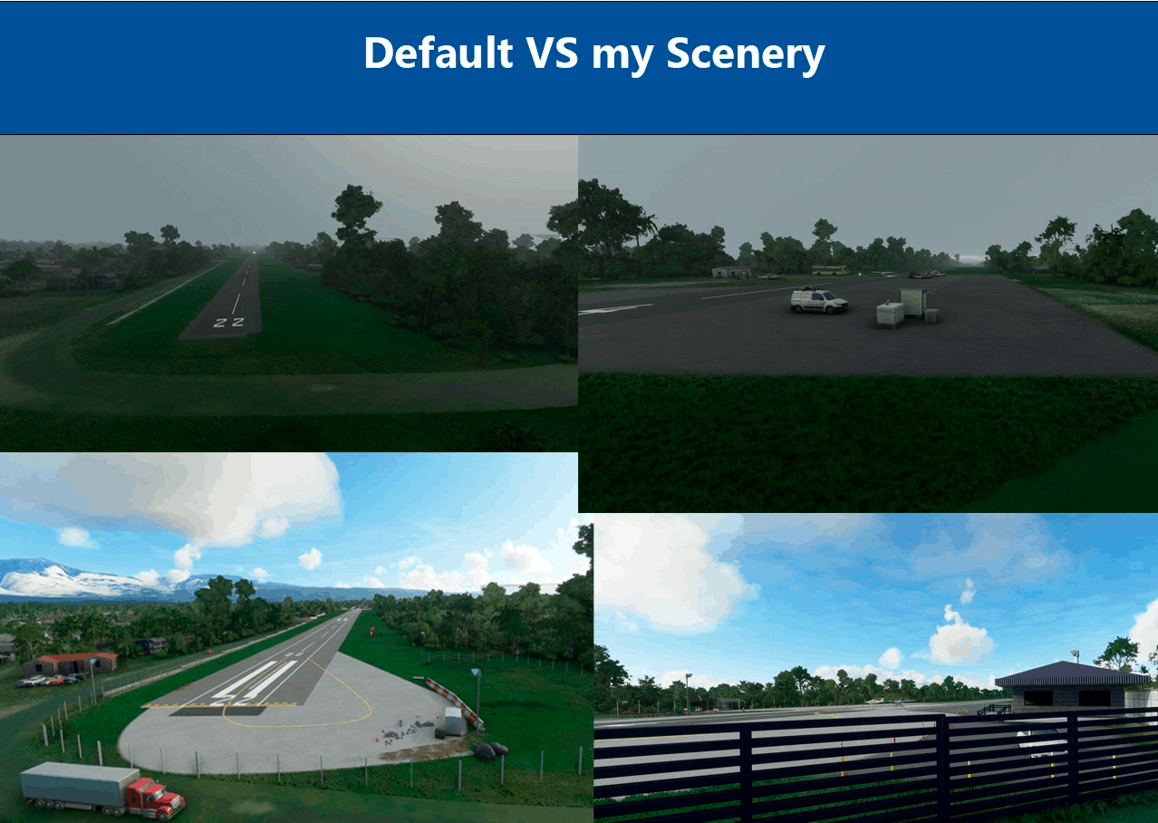 This is my first scenery and contribution to our community, I have been trying to learn Blender for a while and then I asked myself how can custom airports be made. This is not a professional look but I tried my best, learning about the SDK is a big curve. I live 1 hour away of the Aerodromo de Guapiles and with the help of google maps, own photos, facebook photos and the SDK included models I did the work. Hope you like it and have the chance to fly more using it as a destination or departure.
