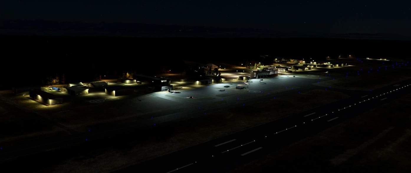In this scenery I have added some GA parking spots and static planes, static elements, fence, hangars and night lighting.