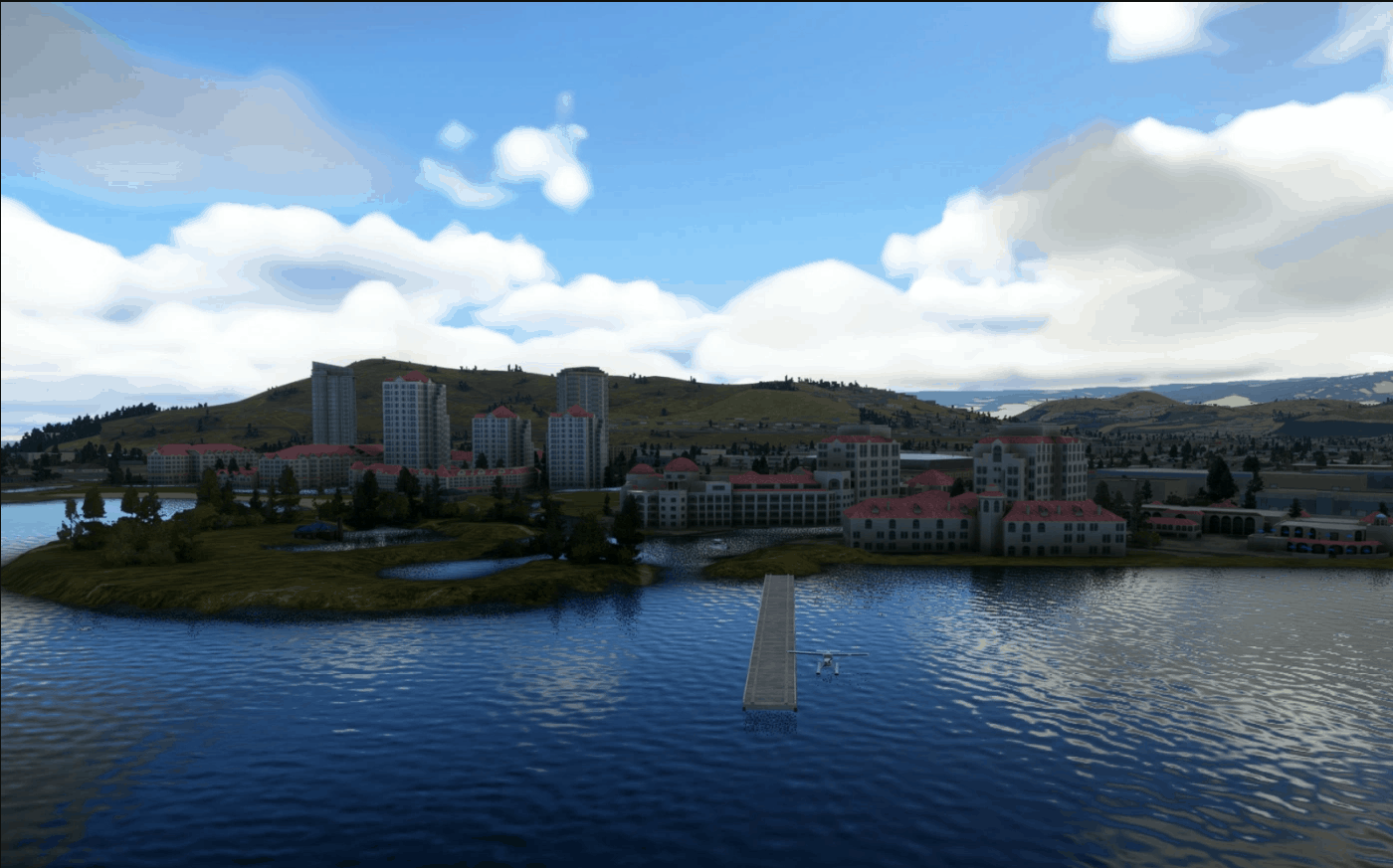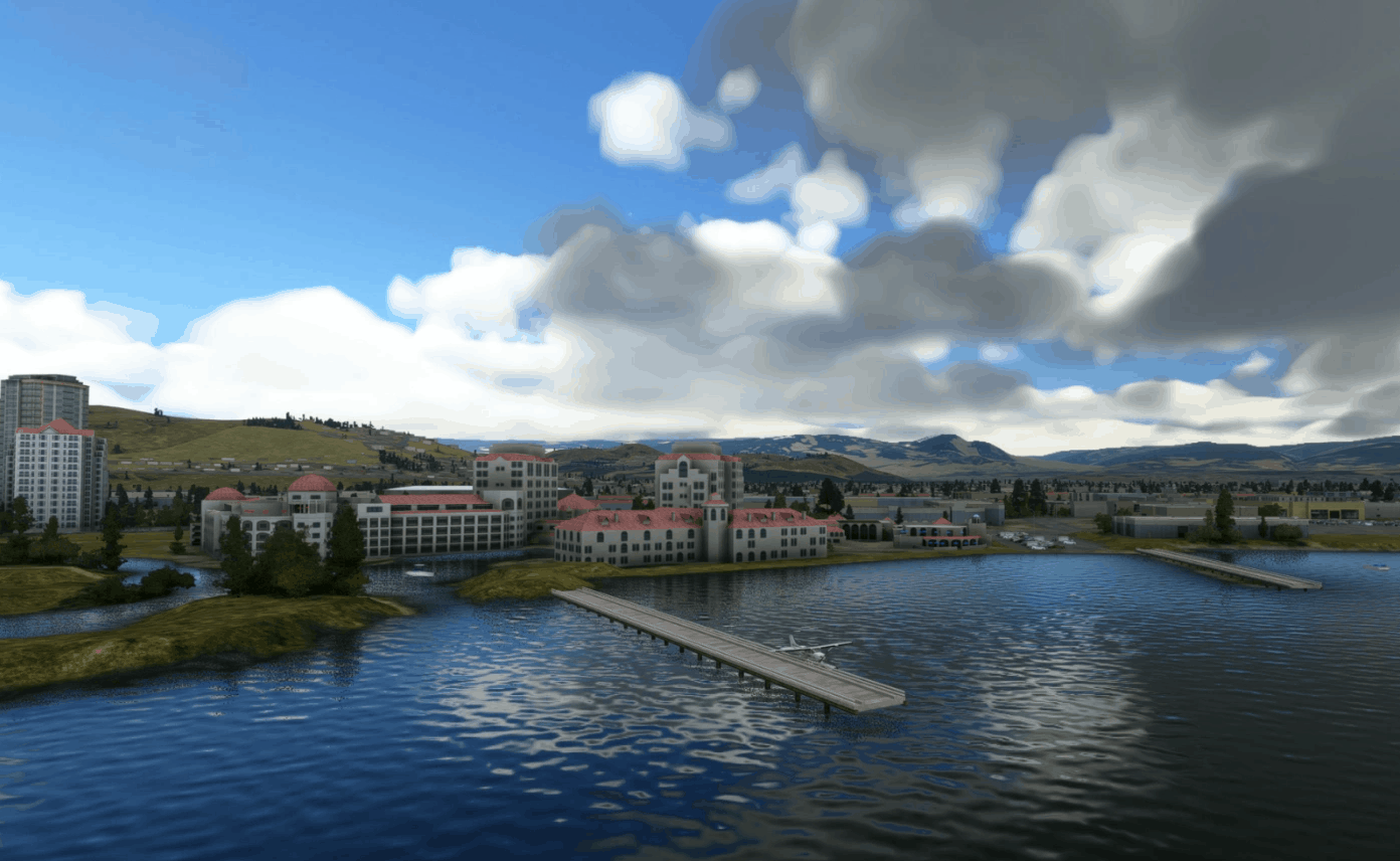 The CYLW scenery here or on MS Marketplace enhances the Okanagan flight experience. But neither expansion adds the float plane dock for Kelowna. I have now fixed that omission as well as done some terraforming on the waterfront. I added trees where they were missing and added some lighting around the Delta Grand.