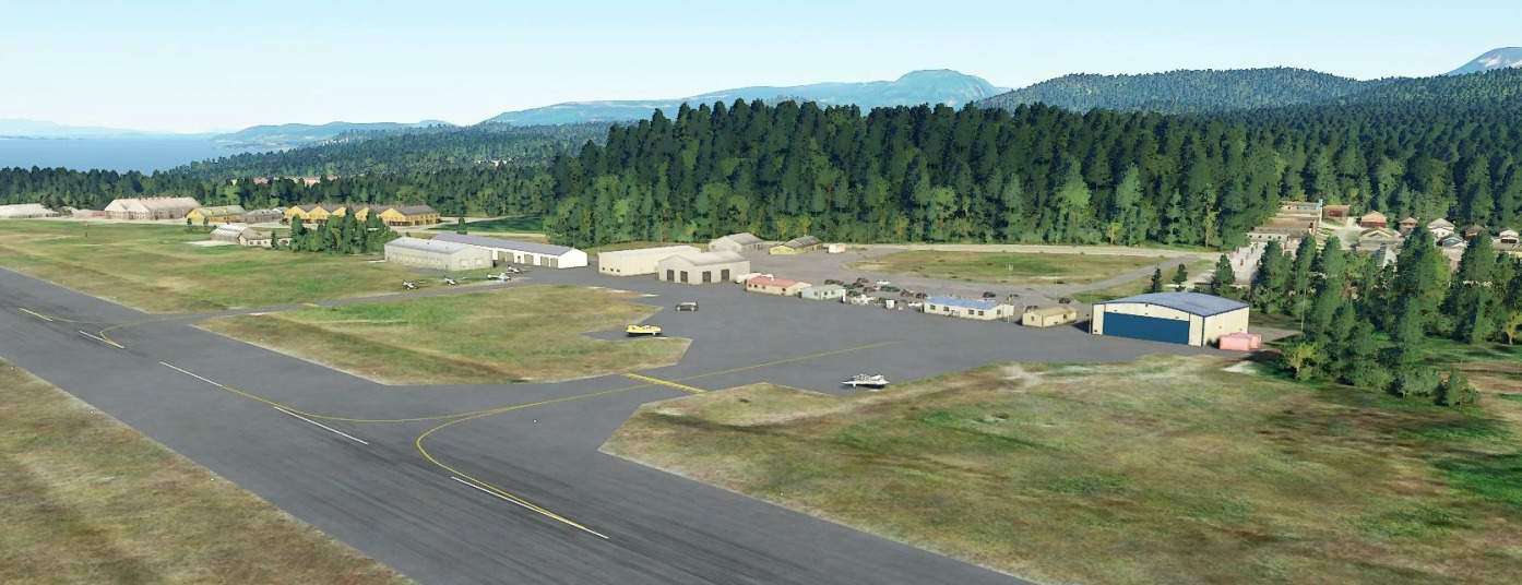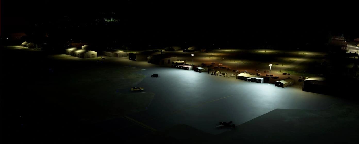 This scenery replaces most of the buildings and adds static planes, fence and night lighting.There are no custom buildings in this scenery. It uses only buildings currently available in the SDK.