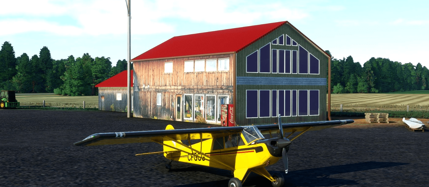This is a fun little sport plane grass strip just east of Hawkesbury, Ontaro. I dropped in there one day and took a few pictures that I have turned into some custom buildings for you, like the “out house” and main building.
