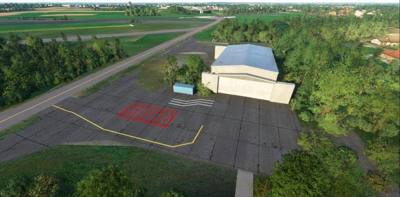 – New hangar and apron next to Droneport building missing –> On hold until accurate satellite imagery and reference material is available- Blurry, square textures around the airport –> Known limitation. Satellite imagery is blurred due to MIL airfield- Roof of Droneport building is green –> Known limitation, due to AI generated building on top of old satellite images- Runway designators and threshold markings too big –> On hold until more customizable SDK is available- Car park not finished near Droneport –> In progress- Inaccurate taxi centerline markings –> On hold until better/more recent satellite imagery is available- Fences around airport and runway missing –> On hold until more reference material is available to establish correct positions