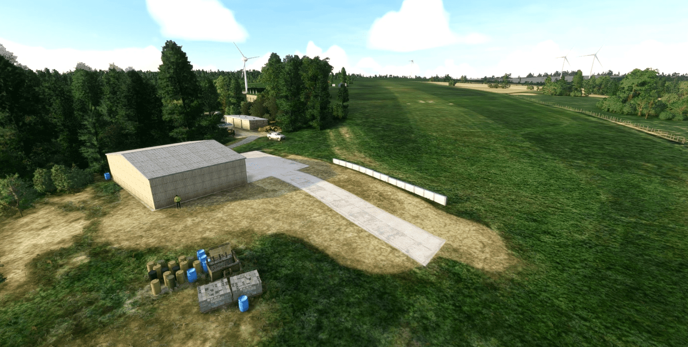 I’ve added fencing, vegetation, the hangar to start in, a few buildings and a bit of replacement ground. I’m not too sure about the runway gradient, it seems a bit linear, so I may return to it.