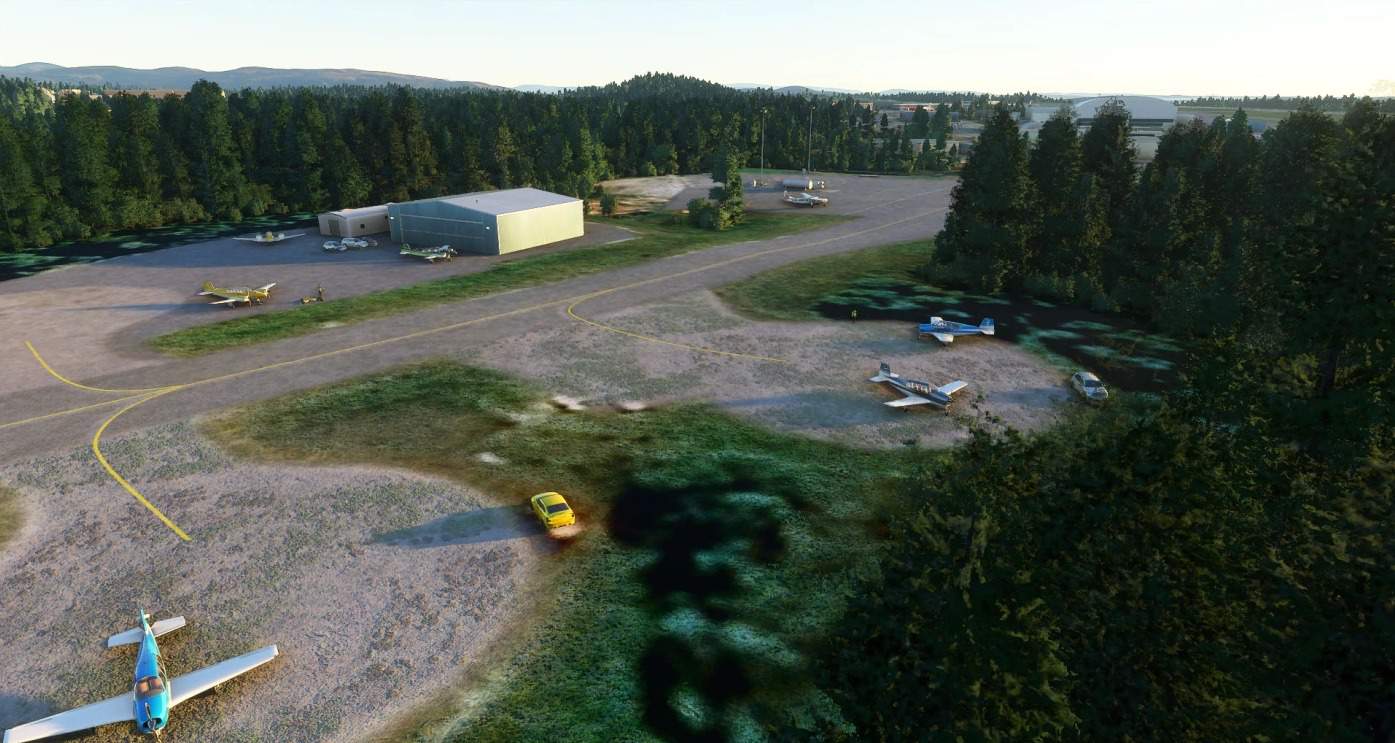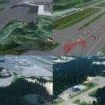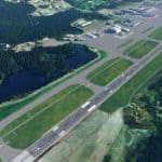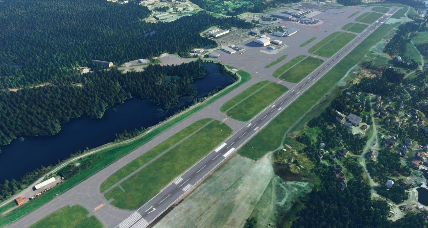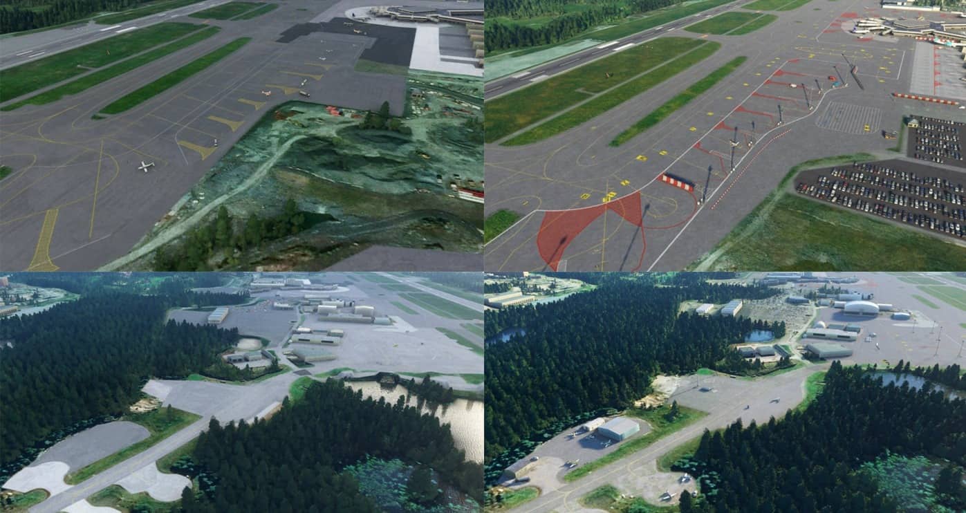 The default airport in flight simulator is unfortunately situated on top of the border between an old and a terrible satellite photo. The ground under the airport also has awful elevation data (It looks like a crater when you remove the default airport). In addition to this, parking, apron and taxiways are based on old data from before the construction of the new terminal, but the visuals include the new terminal.This started as an attempt to cover up and correct these issues, and has evolved into recreating the airport using default 3D assets and some custom ground markings.