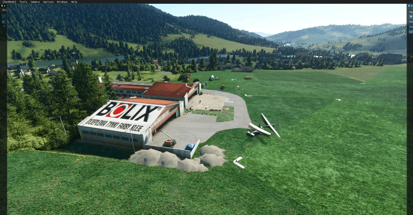 Międzybrodzie Żywieckie – Górska Szkoła Szybowcowa „Żar” AP. Elewacja lotniska 1230 ft (1182/1289). Nie przystojniak kręgu nadlotniskowego. Lądowanie pracy na RWY 05 (RWY 08 pomocniczy). Uwaga: Z uwagi na lądowanie pod stok przejście na drugi krąg od wysokości wyrównania jest NIEMOŻLIWE. Obowiązkowa dwukierunkowa łączność radiowa w ATZ. Zachować ostrożność z uwagi na dużą liczbę lotów paralotni. Uwaga: W okresie wiosennym i jesienno-zimowym częste wiatry halne z kierunku południowego do 10-14 m / s. Budynki lotniskowe wykonane osobiscie, poprawione textury terenu. Podziękowania dla Przemka Haasa za możliwość wykorzystania modeli szybowców.