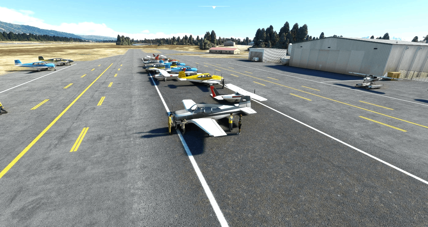 The airport runway, general layout, taxiways, painted lines and parking spots have been kept with stock implementation. I re-implemented from scratch all aprons, airport buildinds, beacon tower and placed the windsocks where they should be. Some minor adjustoments were made to elevation bumps in the taxiways, runway and aprons. Night lighting has been improved as well.