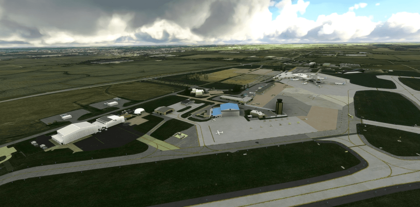 Almost all buildings have been fully modeled from scratch and include high-resolution PBR texturing, including 2021 updated terminal, ATC Tower, Collins Aerospace/Rockwell Collins hangar and area, Signature flight services FBO building and hangar, airport maintance building, public safety building, airport administration building, GA hangars, “Seagull” sculpture at entrance of airport, custom “feet left on runway” signs, and more.
