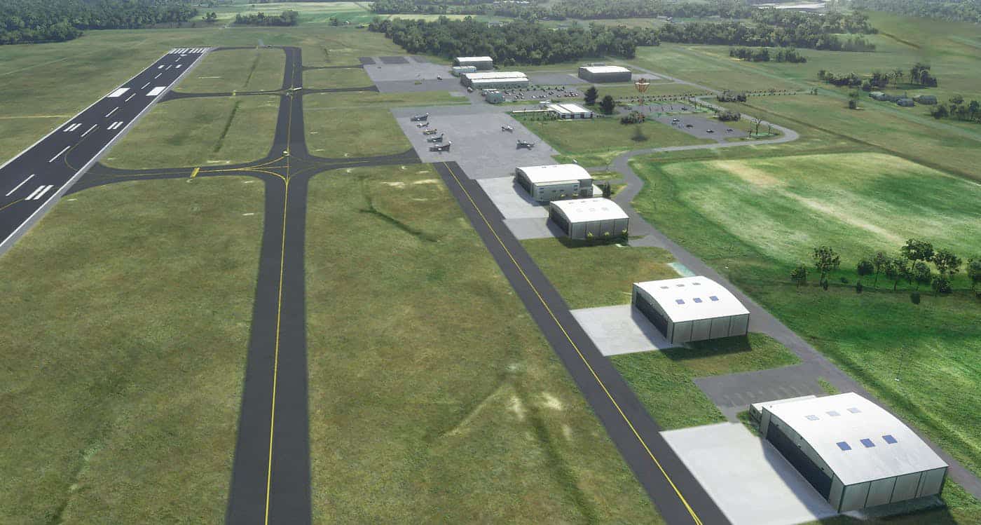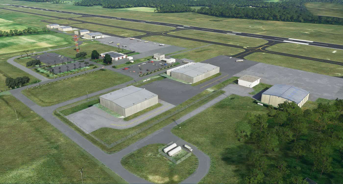 Rocky Mount – Wilson Reg’l Airport is located in eastern North Carolina, about 10 miles from Rocky Mount. In FS 2020, KRWI was a clean slate, no 3-D objects. From FS 2020 objects, I have placed 7 hangers, terminal bldg., 6 other support facilities, trees, bushes, fences, traffic lights, support equipment. and other misc. items.