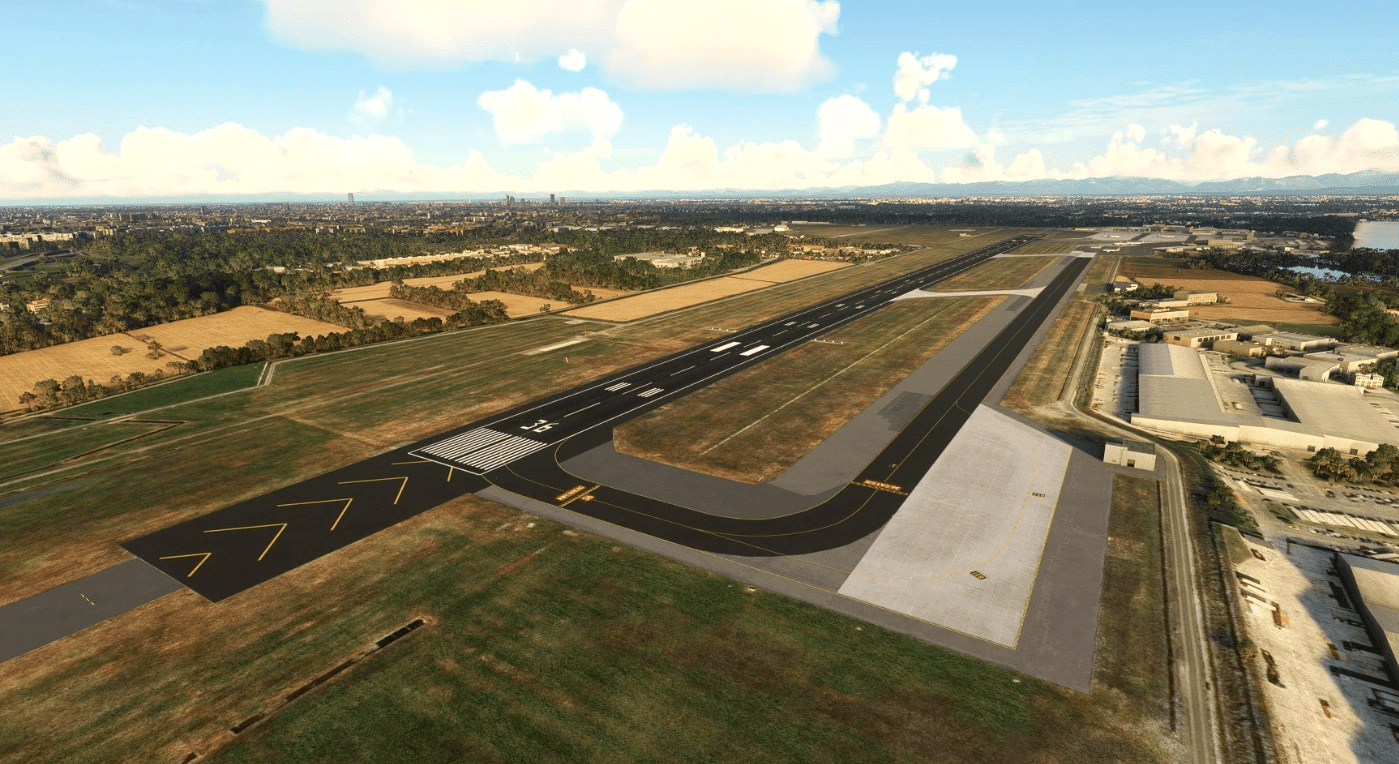 Located directly east of the city of Milan, the Linate airport serves as a hub for ITA (former Alitalia) and destination for multiple European airlines. This city airport provides a terminal with five gates, two runways (runway 36 with ILS) and a hangar with huge Emporio Armani emblem.